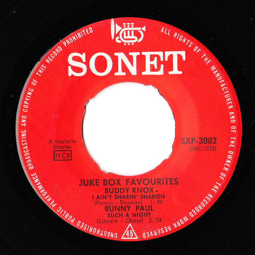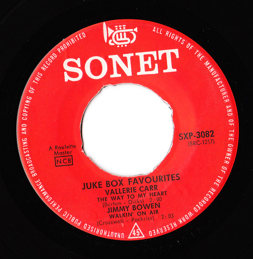 hallo gruß an alle plattenfreunde die dritte sonet ep ist ein sampler der ganz besonderen qualität vier kracher auf einer platte sonet sxp 3082 valerie carr-the way to my heart,jimmy bowen-walkin' on air,buddy knox-i ain't sharin' sharon,bunny paul paul-such a night viel vergnügen und keep rockin' albert