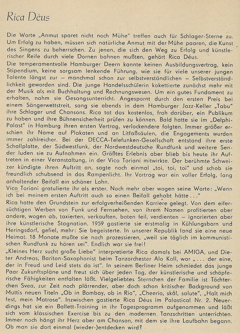 Die Schauspielerin und Sängerin Rica Déus wurde am 7. Februar 1937 in Hamburg, BRD, als Erika Scheele geboren. In ihrer Jugend kellnerte sie in diversen Lokalen und unterhielt am Abend auch die Gäste mit ihrem Gesang, wobei sie von einem TELDEC-Mann entdeckt wurde und 1958 einen Plattenvertrag unterschreiben konnte. Die Gastspiele die darauf folgten, führten sie unter anderem auch in die damalige DDR, wo sie den Saxophonisten Dieter Andreas, der beim DDR-Tanz-Orchester Alo Koll engagiert war, kennenlernte, und der zu ihrem Lebenspartner wurde. Im November 1961 zog sie zu ihm nach Ost-Berlin, wo sie bei der Plattenfirma AMIGA ihre Gesangs-Karriere fortsetzte.