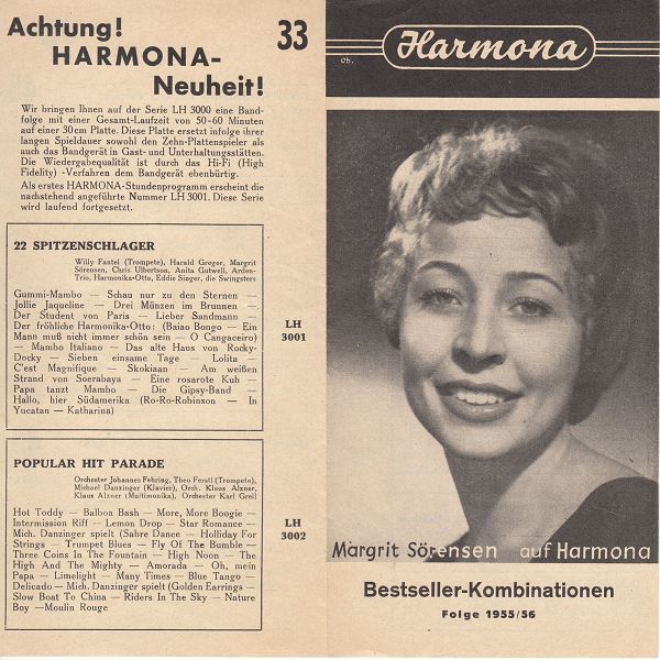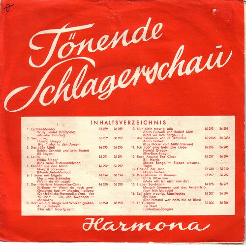 Nicht nur die DEUTSCHE GRAMMOPHON hatte eine "Starparade", auch bei HARMONA 3D gab es so etwas und da hieß es halt "Tönende Schlagerschau". Und so hat das zum Beispiel im Mai 1956 ausgesehen