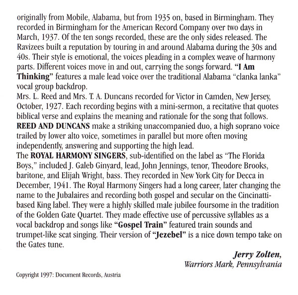Much of the Jubalaires' music was initially issued by Queen Records, a subsidiary of King Records specializing in African-American music; later reissues appeared on King Records proper.