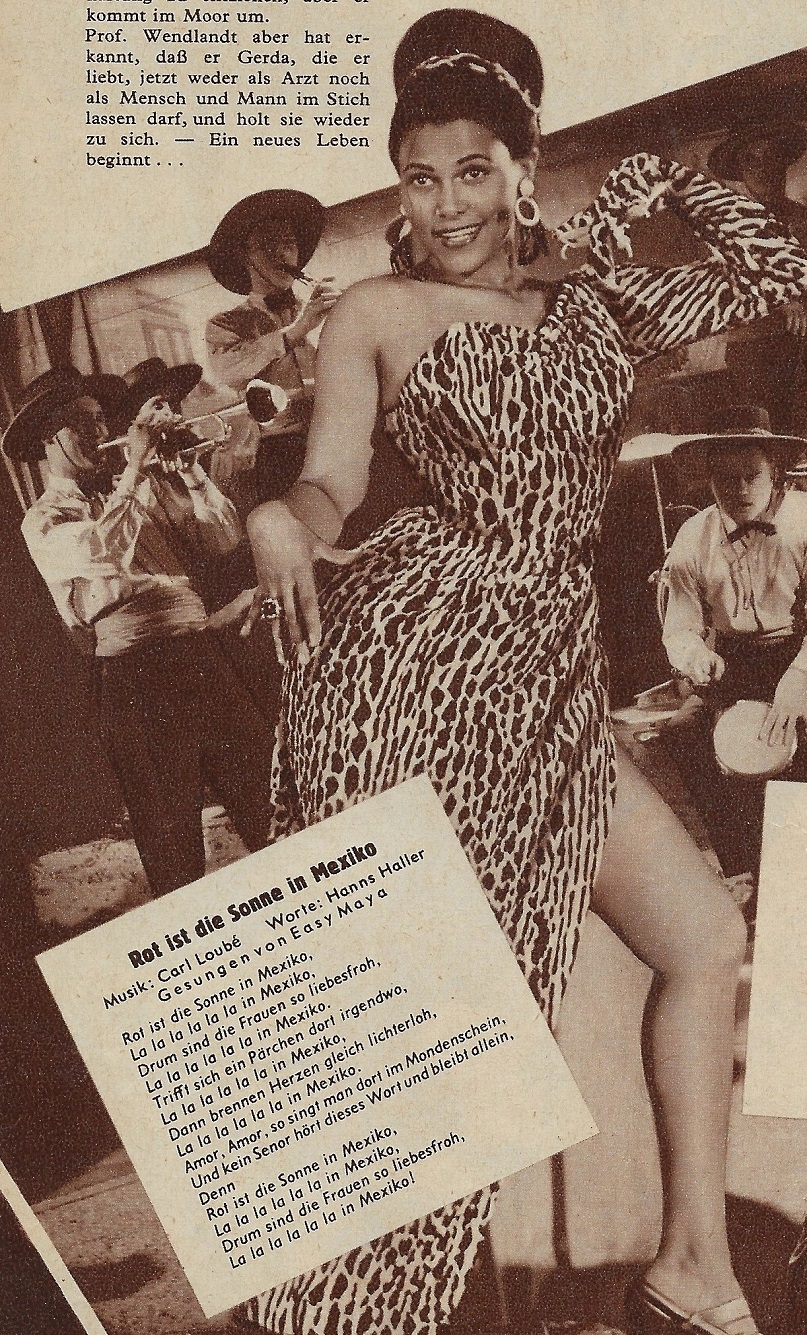 Zurück zu Easy Maya. Die Tatsache, dass Götz Alsmann sie als Beispiel für guten Schlagergesang nannte, sollte genügen, um sie ein wenig aus der Versenkung zu holen. Vielleicht kommen ja demnächst noch wirkliche Informationen dazu. Es gibt die Information, dass sie aus Südamerika stammt. Aufgrund ihrer Plattenaufnahmen und des Films vermute ich, dass sie vorwiegend in Österreich tätig war. Passend dazu gibt es eine Information über eine Veranstaltung der Wiener Bachgemeinde im Schubert-Saal des Konzerthauses der Wiener Staatsoper am 13. November 1955. Als eine der Solisten ist dort die Altistin Easy Maya genannt.