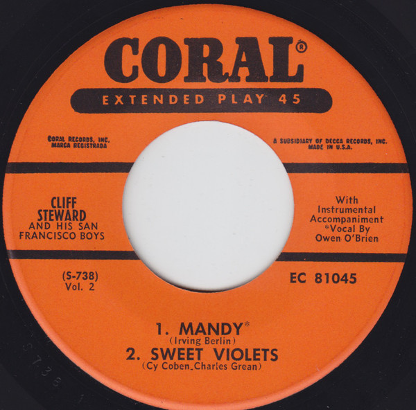 07 52....9-60782....CLIFF STEWARD And The San Francisco Boys Vocal By Owen O'Brien With Instrumental Accompaniment..Mandy (45-81192)/CLIFF STEWARD And The San Francisco Boys Vocal With Instrumental Accompaniment..Down In The Heart Of The Gas-House District (45-80421)