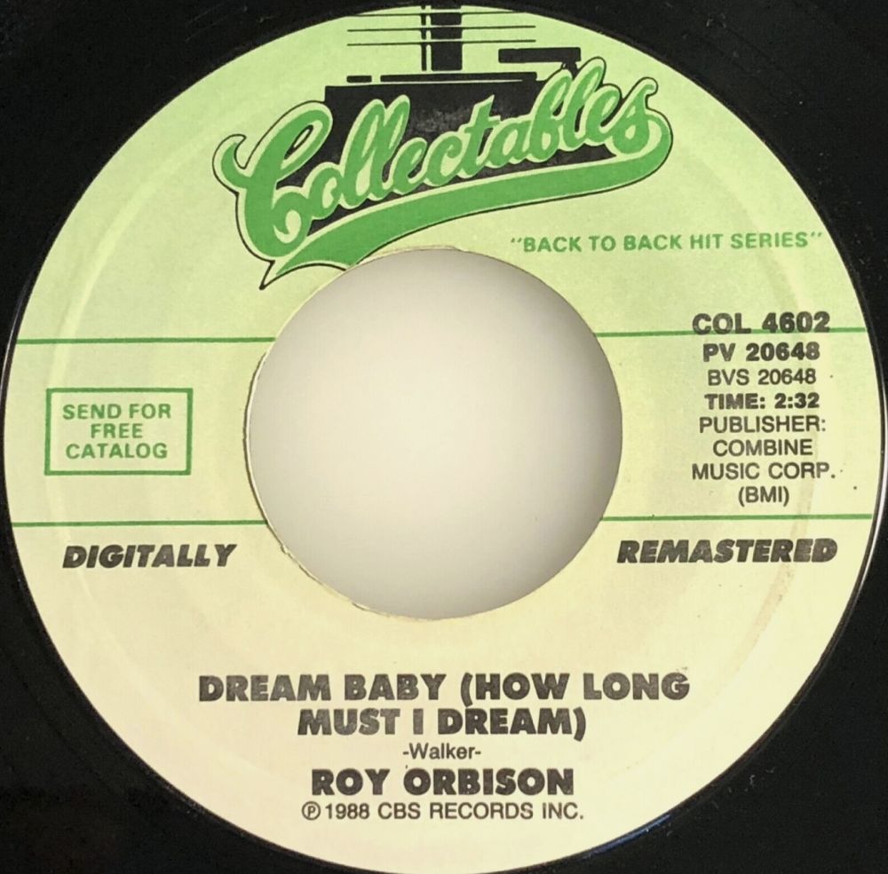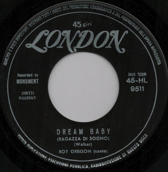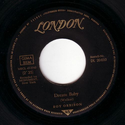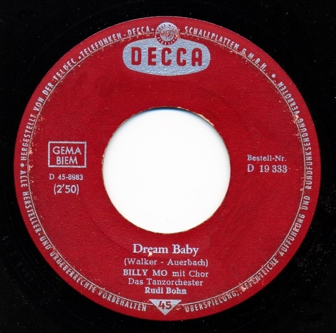 1962 kam Roy Orbisons "Dream Baby" in den USA auf MONUMENT (45-456) heraus. Davon habe ich leider keine deutsche Pressung (gab's denn eine?). Es gibt reichlich Coverversionen: Sylvie Vartan, Lucky Blondo und Richard Anthony sangen es in französisch. Del Shannon, Jerry Lee Lewis und Waylon Jennings auf englisch. Auch die Beatles hatten den Song bei ihren BBC-Radio-Sessions im Programm. Die einzige mir bekannte deutsch gesungene Version ist von Billy Mo und vom feinsten.
