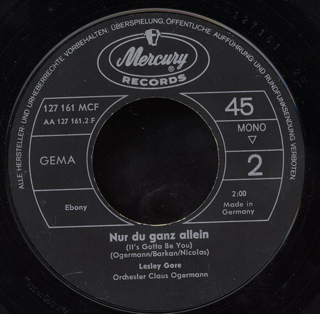 Lesley Gore hat meines Wissens auch drei deutschsprachige Scheiben herausgebracht. Eine davon ist die Mercury Single 127161 von 1964 (Little, little Liebling / Nur du ganz allein).