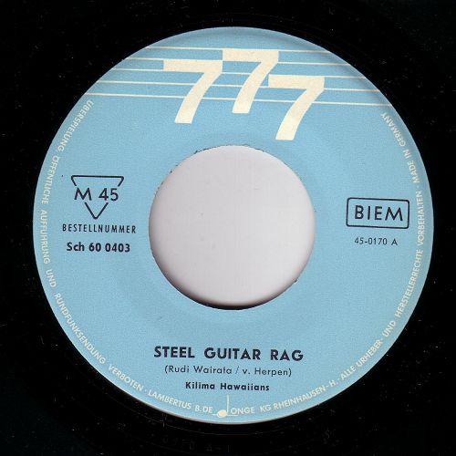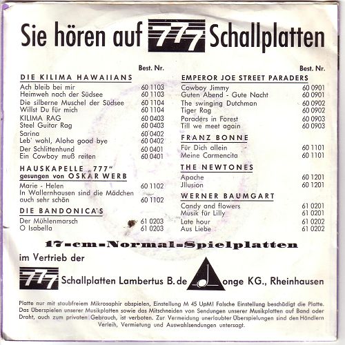 Das kleine Label "777" gehört auch unbedingt zur Geschichte der deutschen Plattenindustrie. Wobei die zwei Instrumentals der Kilima Hawaiians "Steel Guitar Rag" und "Kilima Rag" wahrscheinlich die Herzen der Gitarre-Instrumental-Fans höher schlagen lassen. Die anderen Aufnahmen der Kilimas sind nette gesungene Schlager, die sicher auch ihre Anhänger haben. Auch Werner Baumgrtner (einmal nicht die Kilimas) spielt zwei nette Klarinetten-Slow-Rocks. Übrigens, die Rückseite der "Werner Baumgartner - Hülle" zeigt ein kleines Angebot der Firma "777"
