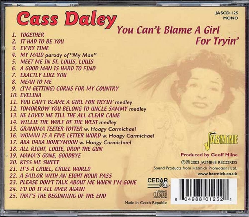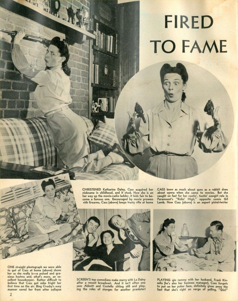 Die Schauspielerin und Komödiantin von Radio, Film und Fernsehen Cass Daley, die auch als Sängerin unterwegs war, wurde am 17. Juli 1915 in Philadelphia, Pennsylvania, als Catherine Dailey geboren und verstarb am 22. März 1975 in Los Angeles, California, erst 59-jährig, nach einem unglücklichen Sturz in ihrer Wohnung.