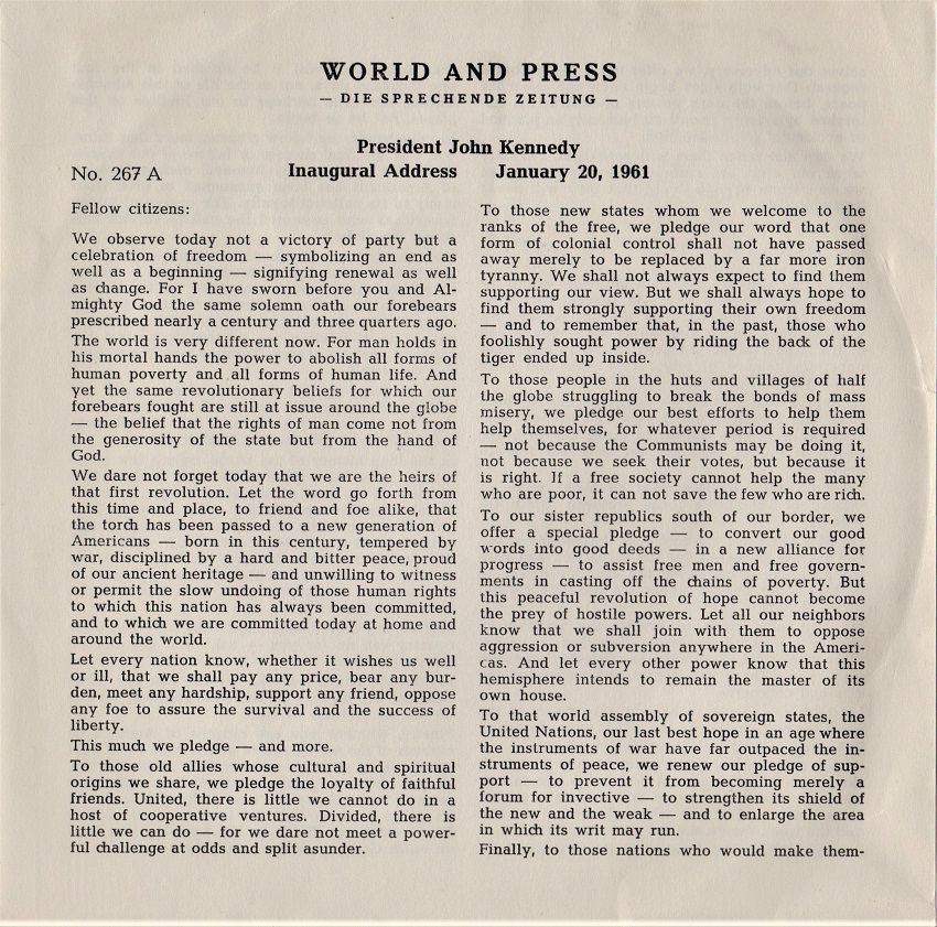 kaum hatte ich meine Schultüte abgelegt und der Kampf des Lebens begann, hielt John F. Kennedy seine erste Rede.