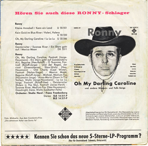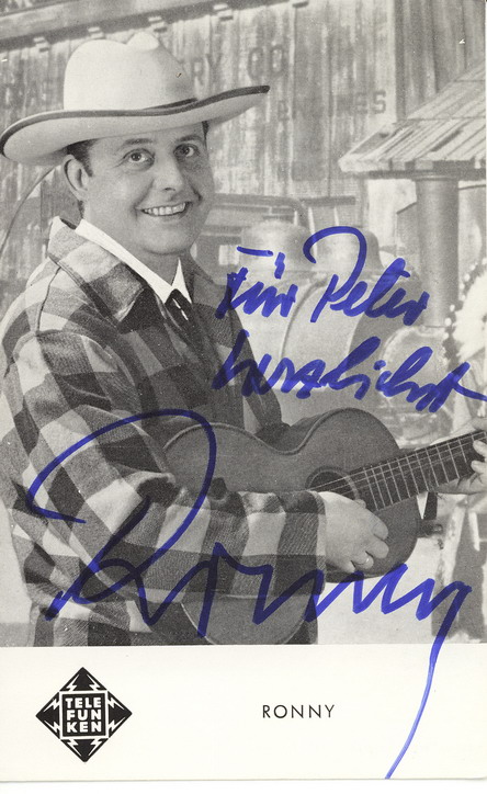RONNY (WOLFGANG ROLOFF) * 10.03.1930 in Bremen, + 18.08.2011, Musiker u. Sänger, 1954-59 als Bassist im VALERIE-TRIO, 1959-61 als BOB (HILL) und EDDY (BÖRNER), 1961 The TELESTARS & WERNER LAST), COLORADOS (& ROLF SIMSON), 1963/64 Telefunken U 55546 (u.a. "Oh My Darling Caroline"-1964, "Jesse James"-1968), 1964 Tour mit Nashville-Stars, 1967 MAXIM BORIS and his Orchestra (& KARL-HEINZ BECKER), ab 1967 Hits mit HEINTJE, 1971 ROGER FORD and his Orchestra und GECK + GAG (& KARL-HEINZ BECKER), Textautor, Komponist, Produzent, Ton-Studio-Betreiber (0421-259291), Ps.: OTTO BÄNKEL, CD "John Wayne, Der Held und weitere Geschichten aus dem Wilden Westen"-1998 auf Bear Family Records