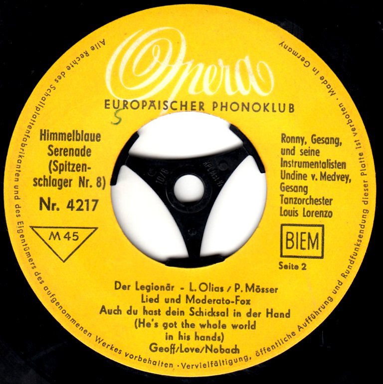 "Bel Sante", "Heimatlos", "Einmal In Tampico", "Wo Meine Sonne Scheint (Island In The Sun)", "Ich Bin Ein Vagabund (Love Is A Golden Ring)", "Wumba-Tumba Schokoladeneisverkäufer Vom Andern Stern (The Purple People Eater)" & Das TRIO SORRENTO, "Die Gitarre Und Das Meer" & Das TRIO SORRENTO, "Charly Brown" & Das TRIO SORRENTO, "Souvenirs", "Jonny, Sing Dein Lied Noch Einmal"/"Kriminaltango", "Unter Fremden Sternen", "Oh, Oh, Rosi", "Babysitter-Boogie" als RONNY und sein Baby, "Der Mann Im Mond" & Das TRIO SORRENTO, "Ohne Krimi Geht Die Mimi Nie Ins Bett" & Die Starband HENRI YOVANI, "Baby-Twist", "Souvenirs",