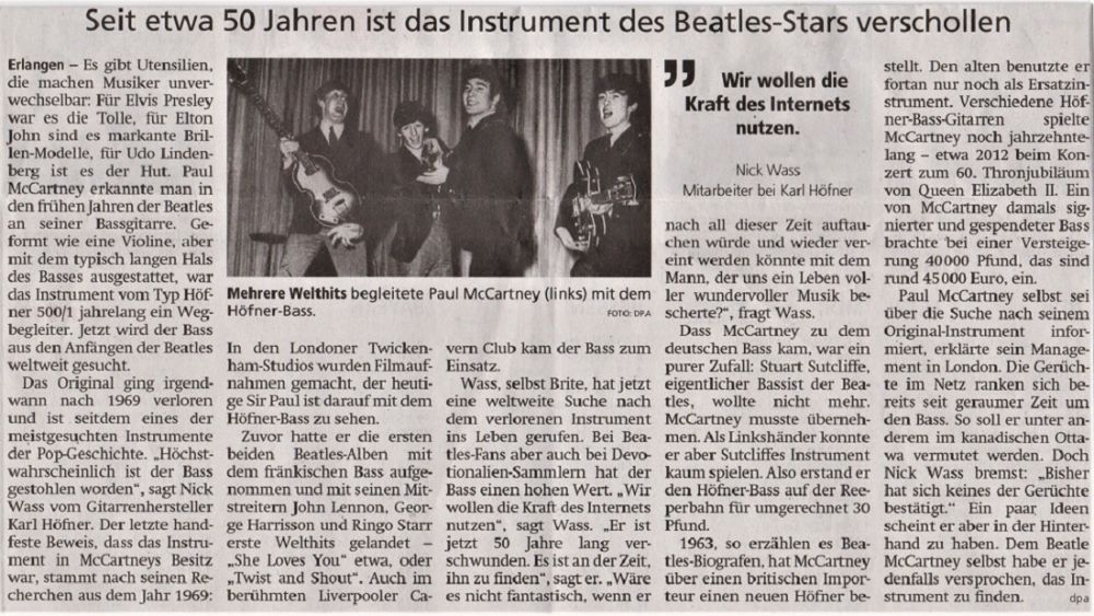 Zeitungsbericht von heute, über Paul´s verschollenen Bass.