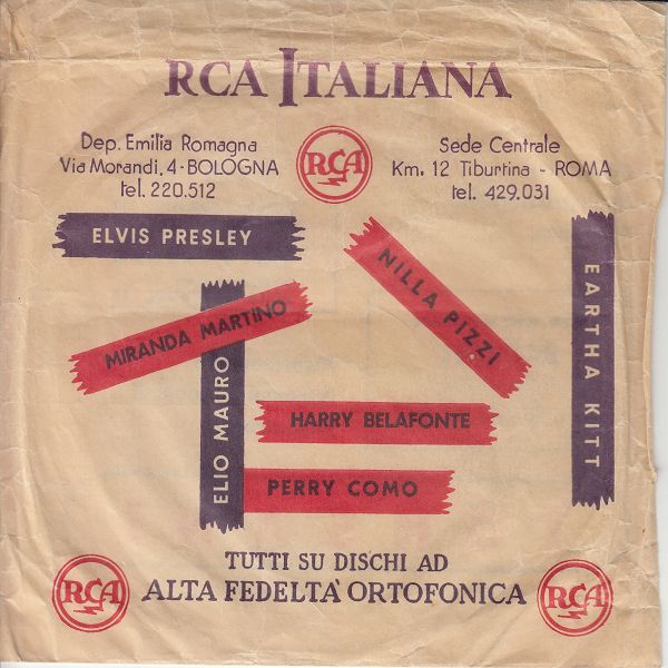 "Plattensackerl" mit Lasche von RCA Italiana als Werbung.
