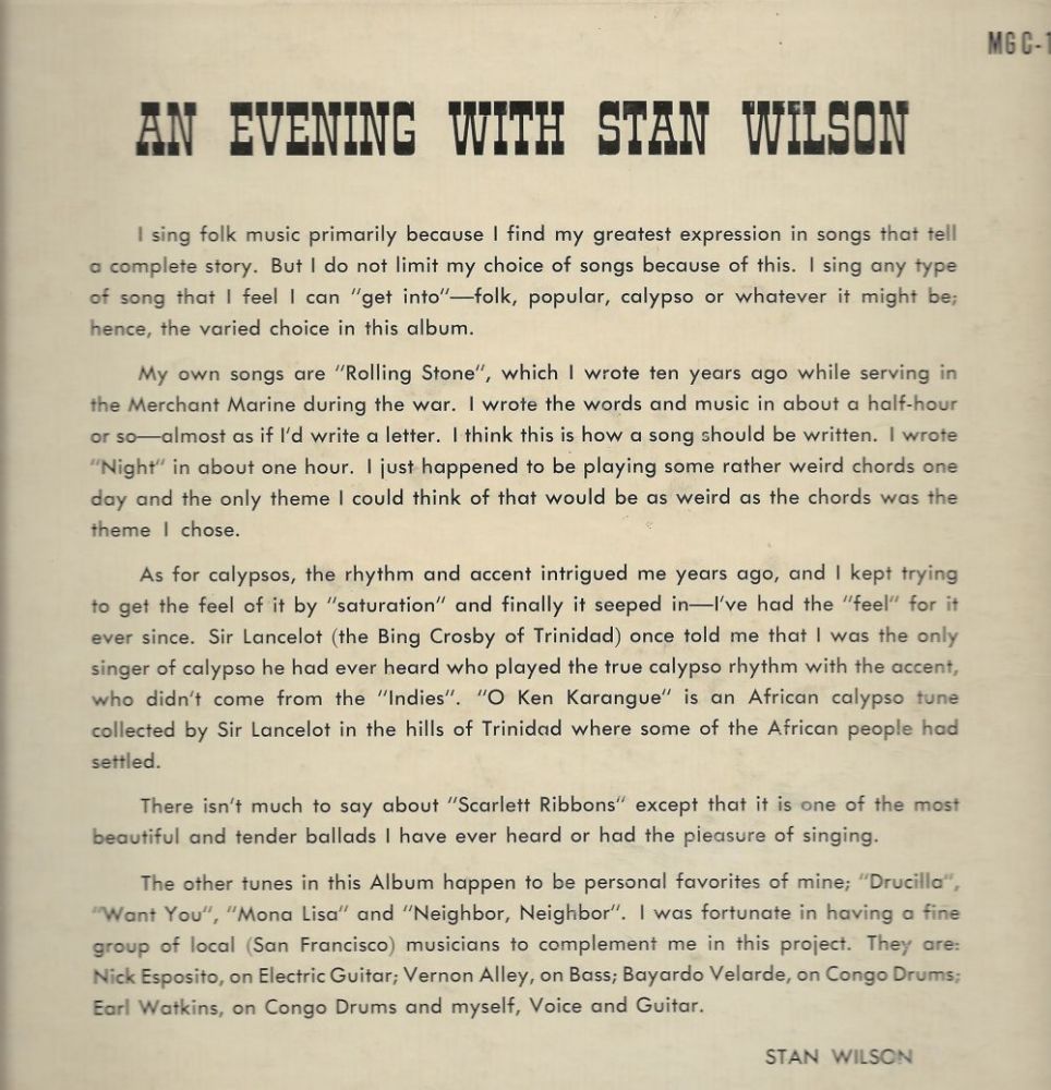 Der Folk-Musiker, Sänger und Gitarrist Stan Wilson wurde am 2. Mai 1922 in Oakland, Kalifornien, als Stanley Clarence Wilson geboren und verstarb am 8. Juni 2005 in Berkeley, Kalifornien.