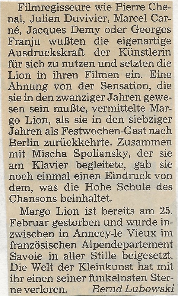 Margo Lion (* 28. Februar 1899 in Konstantinopel; † 25. Februar 1989 in Paris; gebürtig Marguerite Hélène Constantine Barbe Elisabeth Lion) war eine französische Diseuse und Schauspielerin