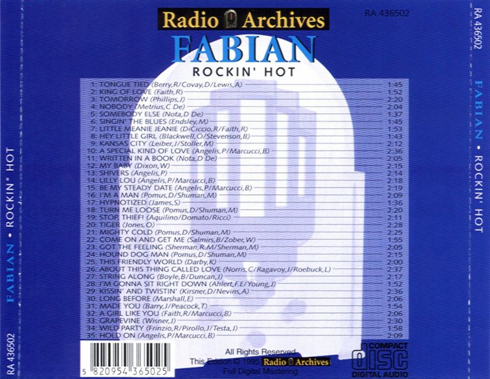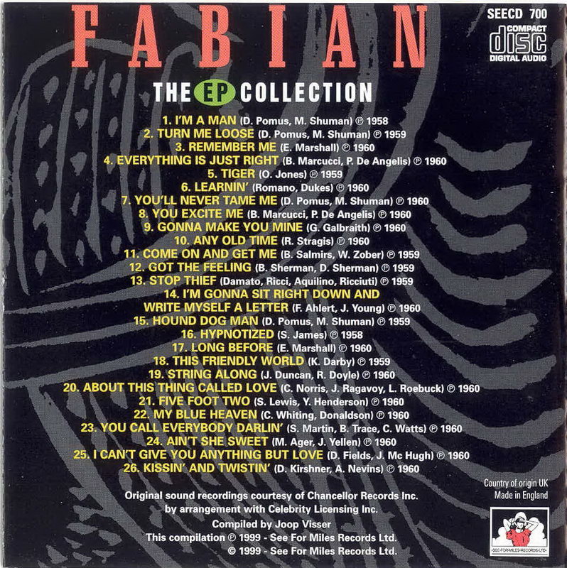 Bear Family legte 2021 mit einer schönen Zusammenstellung des Wirkens des heute Sängers und Schauspielers nach. Anhänge an diesem Beitrag Dateiname: Fabian1a.jpg Dateigröße: 37.35 KB Titel: Heruntergeladen: 202 Dateiname: Fabian1d.jpg Dateigröße: 62.57 KB Titel: Heruntergeladen: 189