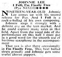 Als Dieter Johnnie Lee mit seiner Instrumental-Formation vorstellte erinnerte ich mich, dass auch ich einen Johnnie Lee in meiner Sammlung habe. Allerdings befindet sich mein Johnnie Lee in meiner "Abteilung Separat" wo ich jene Singles unterbringe die, sanft ausgedrückt, zum Anhören gewöhnungsbedürftig sind was auch der vermutete Grund dafür war, dass ich bisher vergessen hatte, ihn vorzustellen. Ich habe mir natürlich sofort die Single angehört und gefunden, dass es eigentlich gar nicht so schlimm ist. Übrigens unterscheidet sich mein Johnnie Lee von Dieter's Johnnie Lee dadurch, dass er aus Großbritannien stammt und Sänger ist. Ich entschloss mich jedenfalls, ihm nun doch ein Forum einzurichten.