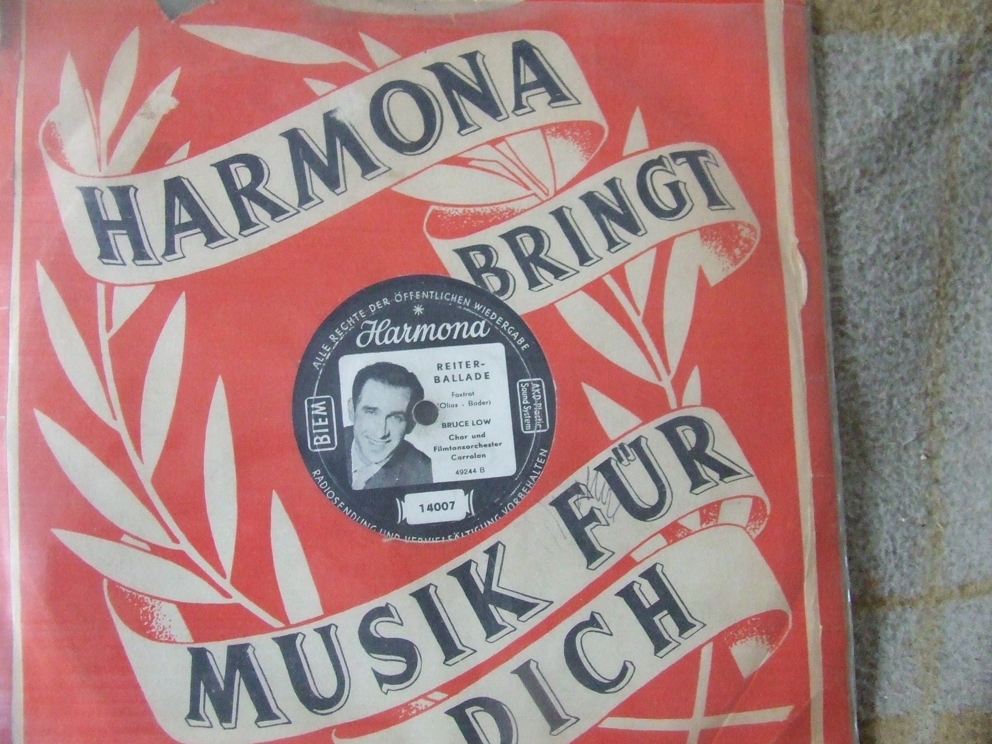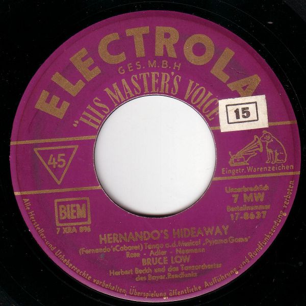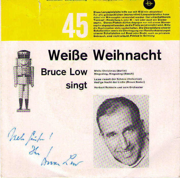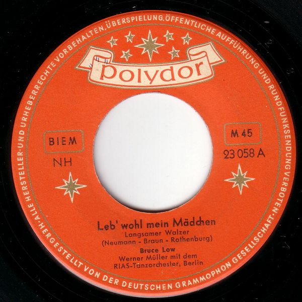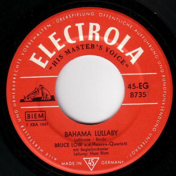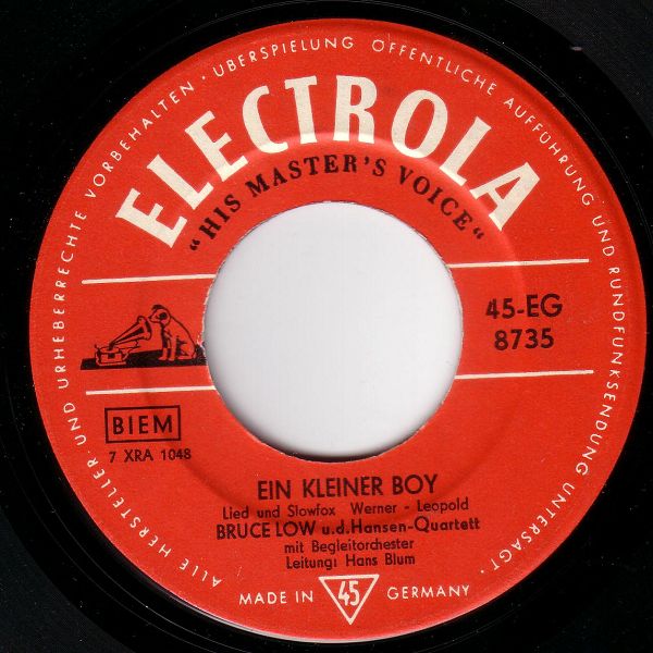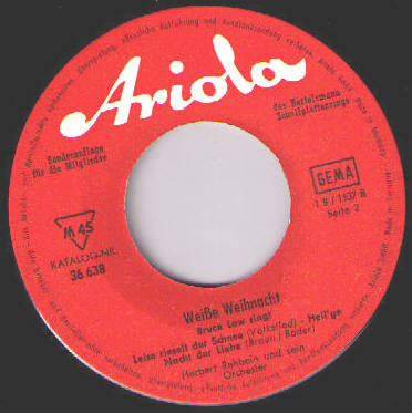 Ariola (u.a. 35557 "Es Begann Im April"/"Ich Suche Deine Liebe"-1960, 35563 "Argentina"/"Die Hirtenmelodie"-1960 & Das JOCHEN-BRAUER-QUARTETT, 45139 "Crazy Bob"/"Blue Missouri (Blue Tomorrow)"-1961 & Chor und Orchester GERT WILDEN, 45231 "Ein Hund Und Eine Katze (A Dog And A Cat)"/"Bis Zum Nächsten Mal" und der RUDOLF LAMY-Kinderchor, 45251 "Hörst Du Mein Heimliches Rufen"/"Heimatland, Heimatland", 45276 "... Ein Zigeuner Ist Mein Herz"/"Leise Rauscht Es Am Missouri", 45391 "... Und Dann Traf Ich Sie Wieder In Frankfurt"/"Fernfahrer-Melodie", "Blaues Meer", "Hafenlicht", "Ich Hab Heimweh Nach St. Pauli"/"Junge, Komm Bald Wieder"-Nov. 1962 BRUCE LOW & Die MOONLIGHTS, KURT HELLWIG, BERND GOLONSKI, WOLFGANG SCHULTE, SIGURD HILKENBACH, GÜNTER KALLMANN u. UDO LEIDOLT, Dirigent: WALTER HEYER, "Seemann, Oh Seemann"/"Das Gibt's Nur Auf Der Reeperbahn"-Nov. 1962 BRUCE LOW & Die MOONLIGHTS, KURT HELLWIG, KUSTER, WOLFGANG SCHULTE, SIGURD HILKENBACH, W. KAHL u. UDO LEIDOLT, Dirigent: WALTER HEYER),