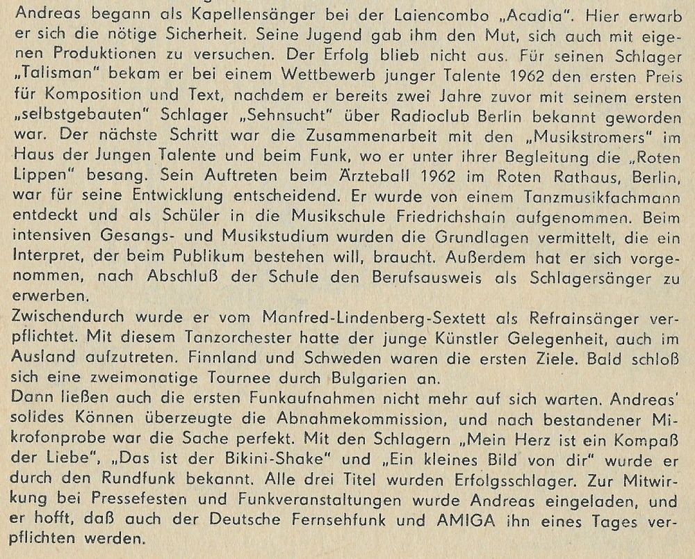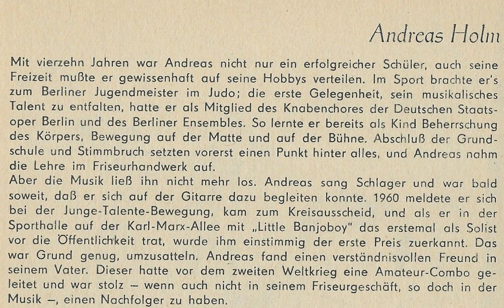 Andreas Holm wurde am 22.10.1942 in Berlin geboren. Schon als Kind hat er gerne und viel gesungen. Mit etwa 12 Jahren wurde er Sänger im Kinderchor der Staatsoper Berlin. Bald darauf nahm er auch erfolgreich an Wettbewerben “Junge Talente gesucht” teil. Schon damals begann er auch selbst Melodien zu komponieren. Als er aus dem Kinderchoralter heraus war, stieg er bei der Laienband “Akadia Combo” ein. Werner Gorges, Lektor des Musikverlages “Lied der Zeit”, entdeckte ihn bei einem Auftritt in Berlin und überzeugte ihn davon, einmal beim Rundfunk vorzusingen. Bald darauf wechselte er zum “Manfred Lindenberg Sextett” Im Jahre 1964 wurde Andreas (damals noch Hans Joachim Hirschler) zu einer Rundfunkprobe eingeladen, die er erfolgreich bestand. Daraufhin wurden für ihn gleich 3 Titel geschrieben: “Mein Herz ist ein Kompass der Liebe”, “Bikini Shake” und “Ein kleines Bild von dir”. Man empfahl ihm, sich einen Künstlernamen zuzulegen. Achim fiel keiner ein und nahm den an, den ihm jemand aus dem Raum zurief - Andreas Holm. Andreas begann für seine musikalische Karriere richtig zu büffeln. In der Musikschule Berlin Friedrichshain nahm er 3 Jahre lang Unterricht in den Fächern Gesang und Musiktheorie. Aber auch in seinem Beruf als Friseur legte er die Meisterprüfung ab. In dieser Zeit arbeitete er tagsüber im Geschäft seines Vaters, abends und an den Wochenenden stand er auf der Bühne und den Musikunterricht an der Musikschule absolvierte er auch noch. Doch die Liebe zur Musik war schließlich stärker und die Zuschauer dankten es ihm. In jedem Jahr gab es mehrere Auszeichnungen und Preise. 1967 war ein ganz besonderes Jahr für Andreas, denn er erhielt seinen Berufsausweis als Schlagersänger und bekam seine erste eigene Fernsehsendung “Holm im Hain”. Bald darauf war Andreas oft mit den Fontanas auf Tournee, einer Berliner Band, der er seit 1966 angehörte. 1971 wurde der legendäre “Musikexpress” ins Leben gerufen. Mit den Fontanas, Thomas Lück, Chris Wallasch, Sascha Thom, Ines Adler und einigen anderen Künstlern tourten sie jede Woche von Donnerstag bis Sonntag durch die damalige DDR und zeigten ein vielfältiges Programm. Trotz der wenigen Zeit, die noch zur Verfügung stand, gab es dennoch viele Fernsehsendungen mit ihm, sowie auch einige Schallplatten und Rundfunkproduktionen. Von Andreas Holm erschienen 5 Amiga Langspielplatten und 31 Amiga Singles, viele Rundfunkaufnahmen gab es und weitere Titel auf verschiedenen Amiga LPs. Aber auch diverse Polydor Produktionen waren im Handel. Fast alle seiner Titel wurden Erfolgslieder und einige davon komponierte, oder textete er selbst. Mit Schlagern wie “Morgenrot - Abendrot”, “Varadero”, “Ein Mädchen wie dich” und vielen anderen sang er sich in die Herzen des Publikums. Doch mit dem Fall der Mauer 1989 schien es mit seiner Karriere zu Ende zu sein und er zog sich auch aus gesundheitlichen Gründen aus dem Showgeschäft zurück. Mit seiner Frau Birgit beriet er, was zu tun ist. Das Ehepaar kaufte sich einen Imbissstand .