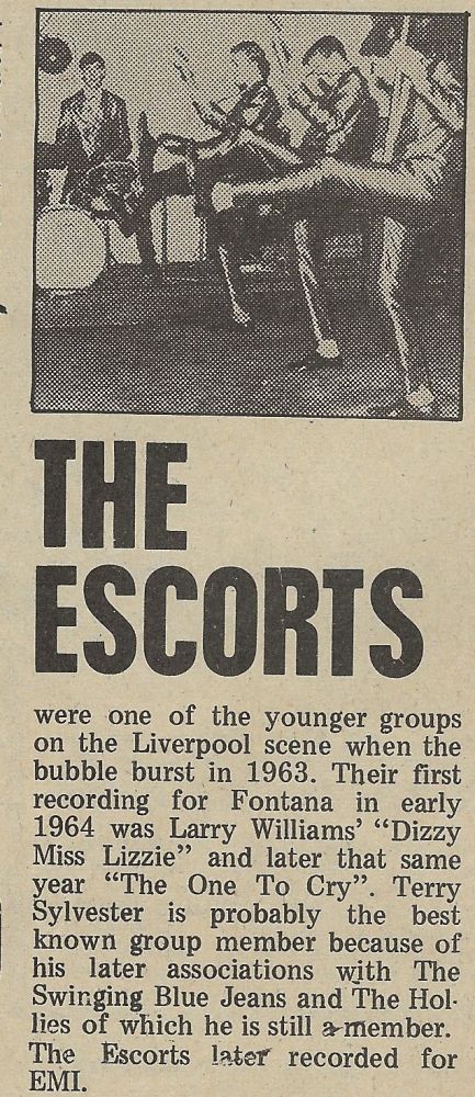 Mike Gregory bestätigte, dass „die Swinging Blue Jeans “You’re No Good“ von uns geklaut hatten“. Die Escorts veröffentlichten “You’re No Good“ nie erneut und ihre zweite Single war “The One To Cry“, ein eingängiger Song, den sie von einem Demo eines Verlegers übernommen hatten. Terry Sylvester: „“The One To Cry“ schaffte es tatsächlich in die Charts. Es landete auf # 49 der nationalen Top 50. Ich habe die Seite noch immer in einem meiner Sammelalben.“