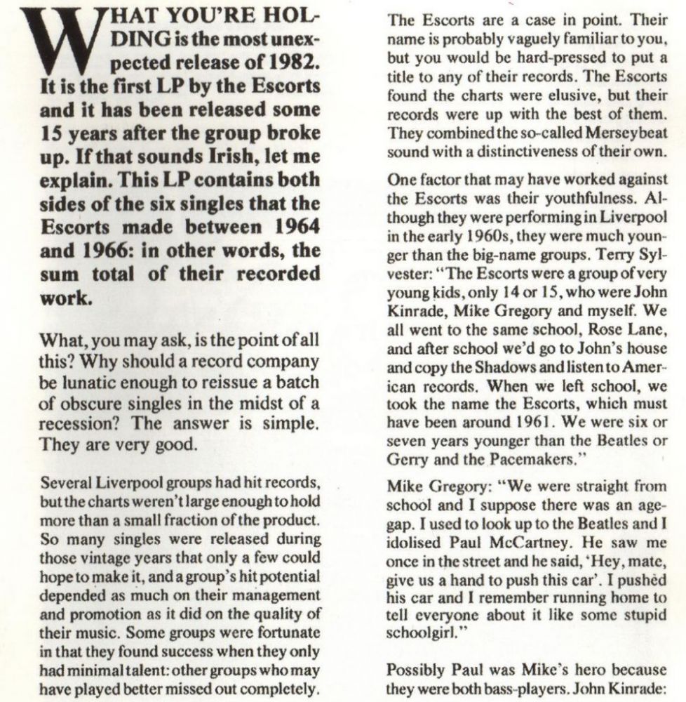 Terry Sylvester: „Die Escorts waren eine Gruppe sehr junger Jungs, erst 14 oder 15, bestehend aus John Kinrade, Mike Gregory und mir. Wir gingen alle auf dieselbe Schule, Rose Lane, und nach der Schule gingen wir zu John nach Hause, machten die Shadows nach und hörten amerikanische Platten. Als wir die Schule verließen, nannten wir uns Escorts, das muss so um 1961 gewesen sein. Wir waren sechs oder sieben Jahre jünger als die Beatles oder Gerry and the Pacemakers.“