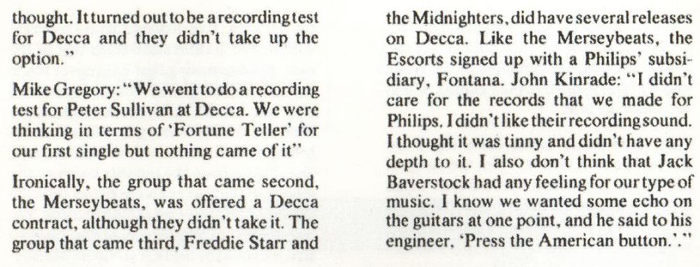 Mike Gregory: „Wir machten einen Aufnahmetest für Peter Sullivan bei Decca. Wir dachten an “Fortune Teller“ als unsere erste Single, aber es wurde nichts daraus.“