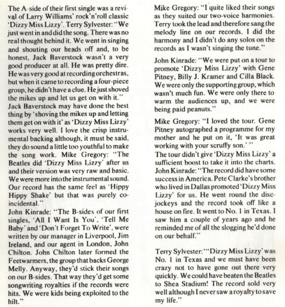 Mike Gregory: „Ich liebte die Tour. Gene Pitney signierte ein Programm für meine Mutter und schrieb darauf: „Es war toll, mit deinem ungepflegten Sohn.“ Die Tour gab “Dizzy Miss Lizzy“ nicht genügend Auftrieb, um in die Charts zu kommen.