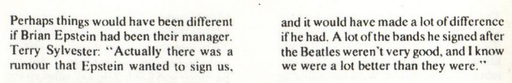 Terry Sylvester: „Dizzy Miss Lizzy“ war in Texas die Nummer 1 und wir müssen verrückt gewesen sein, nicht sehr schnell dorthin zu gehen. Wir hätten die Beatles im Shea Stadium schlagen können! Die Platte verkaufte sich sehr gut, obwohl ich ums Verrecken keine Tantiemen gesehen habe.“ Vielleicht wäre es anders gelaufen, wenn Brian Epstein ihr Manager gewesen wäre. Terry Sylvester: „Tatsächlich gab es ein Gerücht, dass Epstein uns unter Vertrag nehmen wollte, und es hätte einen großen Unterschied gemacht, wenn er es getan hätte. Viele der Leute, die er nach den Beatles unter Vertrag nahm, waren nicht sehr gut. Und ich weiß, dass wir viel besser waren als sie.“