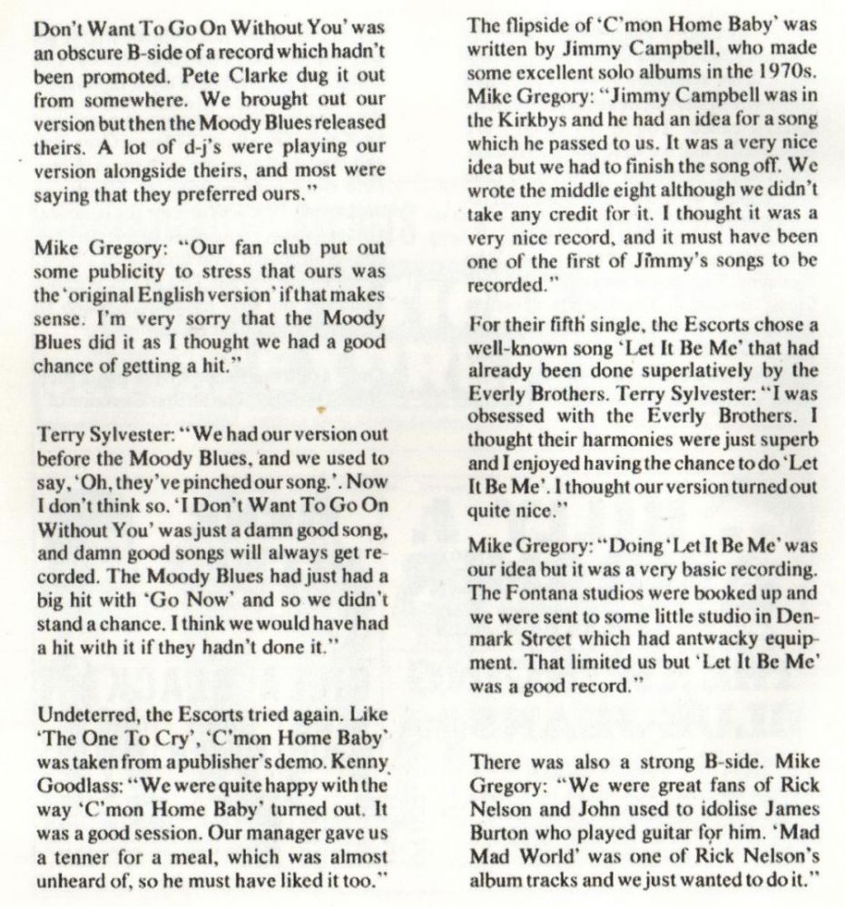 Es gab auch eine starke B-Seite. Mike Gregory: „Wir waren große Fans von Rick Nelson und John vergötterte James Burton, der für ihn Gitarre spielte. “Mad Mad World“ war einer von Rick Nelsons Albumtiteln und wir wollten ihn einfach machen.“ Dann gab es Ärger. Kenny Goodlass: „Ich war etwa zwei Jahre bei den Escorts und wurde dann gefeuert. Ich kam mit Terry nicht klar und er wollte Pete zurückholen.“