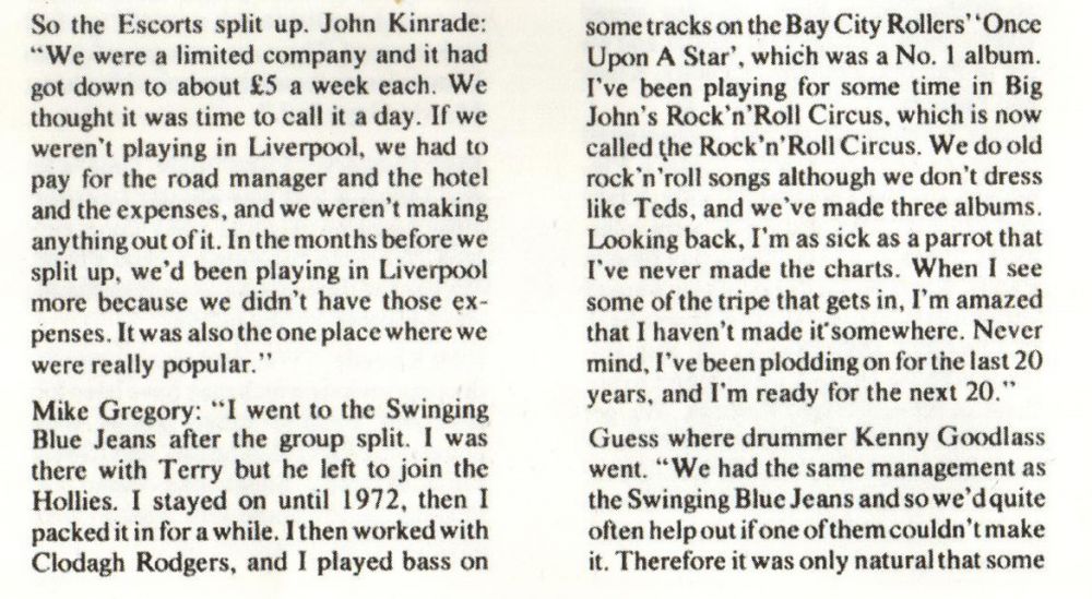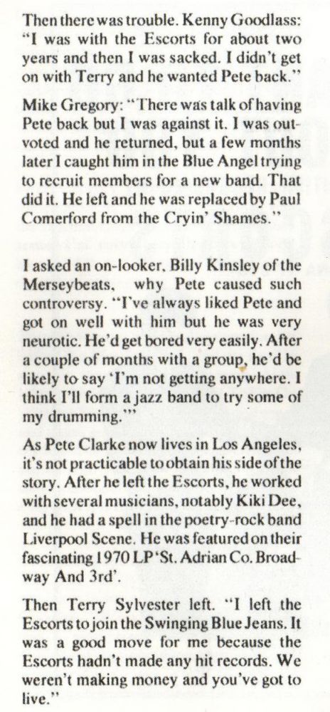 Raten Sie mal, wohin Schlagzeuger Kenny Goodlass gegangen ist. „Wir hatten dasselbe Management wie die Swinging Blue Jeans und haben daher ziemlich oft ausgeholfen, wenn einer von ihnen es nicht geschafft hat. Daher war es nur natürlich, dass einige von den Escorts würden der Band in Vollzeit beitreten. Erst Terry, dann Greg und dann ich. Danach verbrachte ich einige Zeit in den Merseys und dann spielte ich bis vor etwa zwei Jahren bei den Merseybeats. Jetzt spiele ich zwei Abende pro Woche in Sam's Bar in Liverpool. Wir sind zu viert und da Pizzabar-Musik gefragt ist, muss ich alles aufpolstern.“