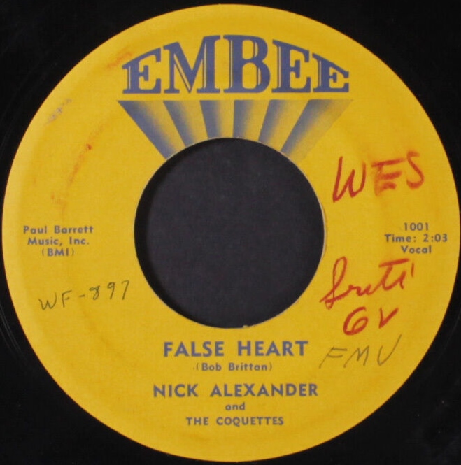Ich besitze eine Single eines gewissen Nick Alexander, dessen Namen ich im Netz zwar mehrmals fand, aber ich befürchte, es war nie der Richtige. Dieser Nick Alexander entspricht eigentlich nicht meinem musikalischen Geschmack. Damit man sich etwas vorstellen kann, in unserem Kulturkreis würden man ihm vermutlich als Operettensänger bezeichnen. Ich habe ihn aber trotzdem nicht verstoßen, ganz im Gegenteil, ich präsentiere ihn dem Forum. Immerhin wurde er schon mehrmals im Billboard vorgestellt, wie zum Beispiel am 8. Juli 1957 mit seiner Single EMBEE 1001 oder am 10. Februar 1958 mit seiner Single A-DORA 1002.