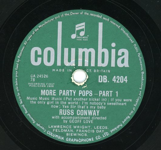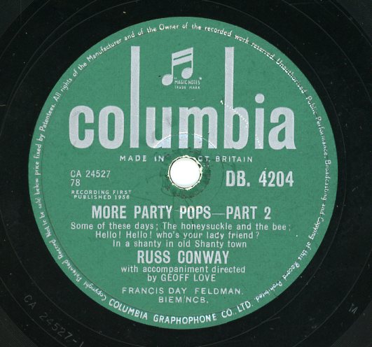 11 58....45-DB 4204....RUSS CONWAY with Accopaniment directed by GEOFF LOVE..MORE PARTY POPS—PART 1 Music Music Music (Put another nickel in); If you were the only girl in the world; I'm nobody's sweetheart now; Yes sir that's my baby (7XCA 24526)/MORE PARTY POPS—PART 2 Some of these days; The honeysuckle and the bee; Hello ! Hello ! who's your lady friend ?; In a Shanty in old shanty town (7XCA 24527)