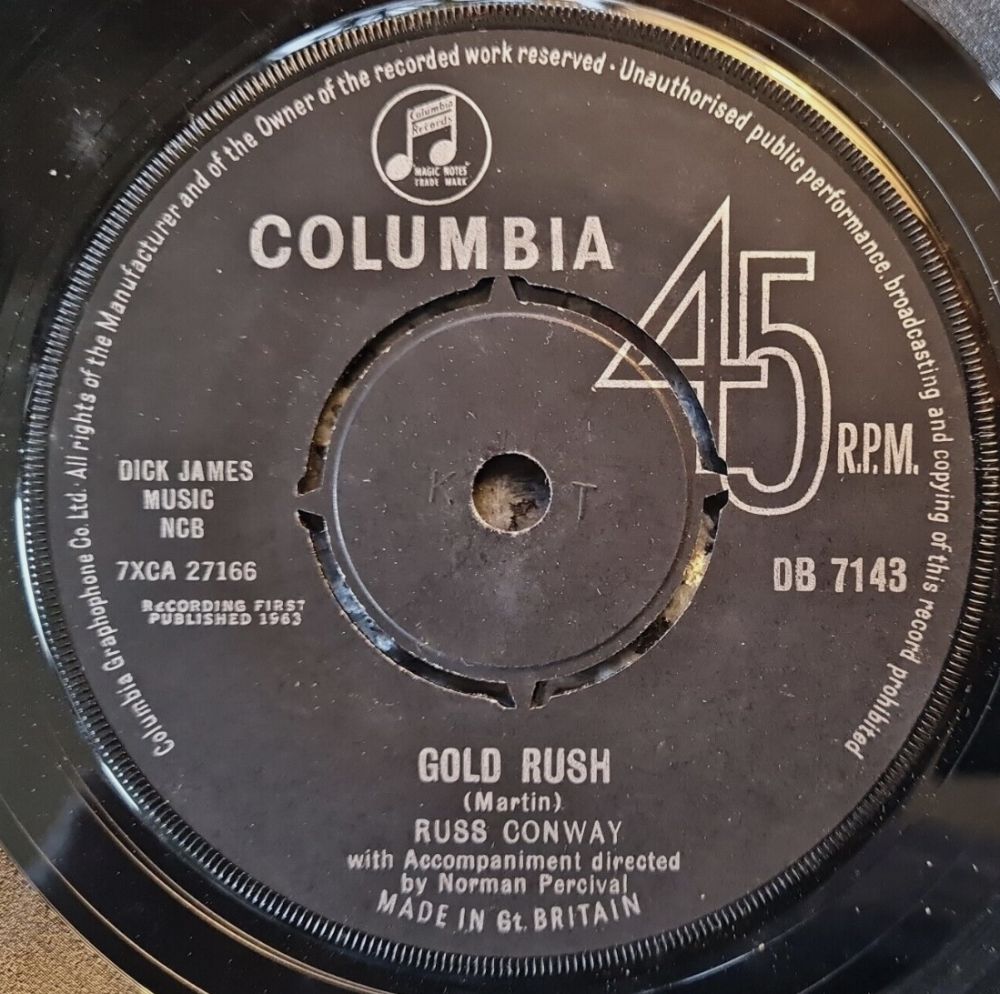 10 63….DB 7143….RUSS CONWAY with Accompaniment directed by Norman Percival..Gold Rush (7XCA 27166)/RUSS CONWAY with children's Chorus and Instrumental accompaniment directed by Norman Percival..Halloween (Europa Melody) (7XCA 27167)