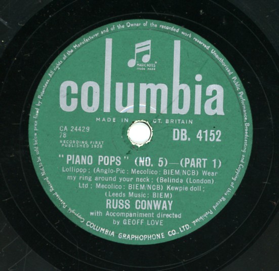 06 58....45-DB 4152....RUSS CONWAY Acc. dir. by Geoff Love.."PIANO POPS" (NO. 5) (PART 1) Lollipop; Wear my ring around your neck; Kewpie doll (7XCA 24429)/"PIANO POPS" (NO. 5) (PART 2) Stairway of love; Tulips from Amsterdam; All I have to do is dream (7XCA 24430)