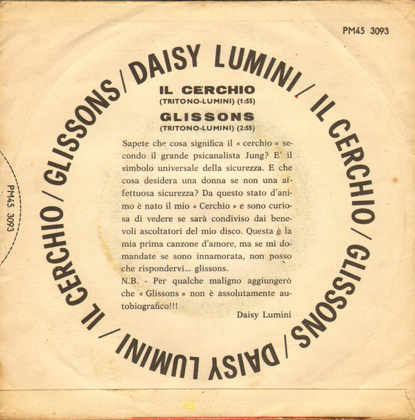 Die Musikerin, Gesang, Gitarre etc., und Komponistin Daisy Lumini wurde am 18. August 1936 in Florenz, Regione Toscana, Italien, als Desy Lumini geboren und verstarb am 18. August 1993, es war ihr 57. Geburtstag, gemeinsam mit ihrem Gatten, den Schauspieler und Theaterleiter Tino Schirinzi, in Barberino di Mugello, Regione Toscana, Italien, in Suizid-Absicht, durch Sprung von einer Brücke.
