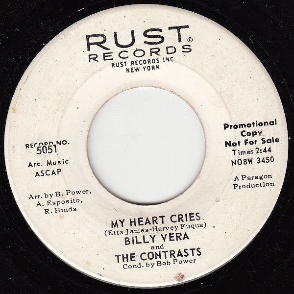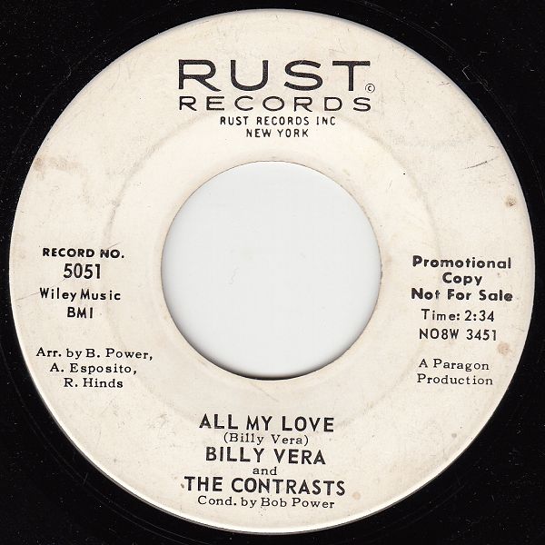 10 62….R 5051….BILLY VERA and THE CONTRASTS Cond. by Bob Power..My Heart Cries(NO8W 3450)/All My Love (NO8W 3451)