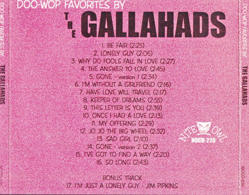 The Gallahads (Seattle, Wa) -- led by Jimmy Pipkin -- are best remembered for "Lonely Guy", an enormous smash hit in 1960 (# 111). Lead vocalist Pipkin, Bobby Dixon (first tenor and lead), "Tiny" Tony Smith (second tenor) and bass man Ernie Rouse formed this vocal group in Seattle/WA in 1952, while they were still in junior high.