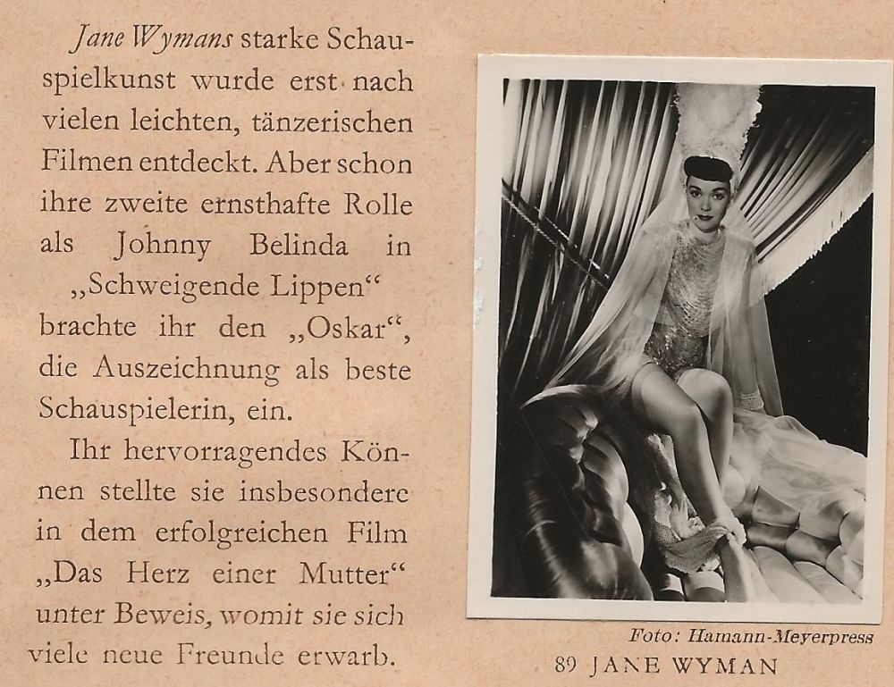 Jane Wyman (* 5. Januar 1917 in St. Joseph, Missouri, USA; † 10. September 2007 in Palm Springs, Kalifornien, USA; eigentlich Sarah Jane Mayfield)