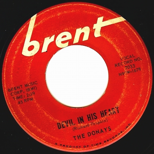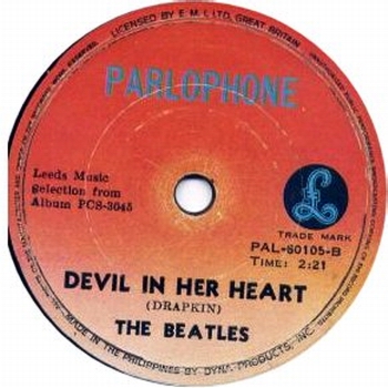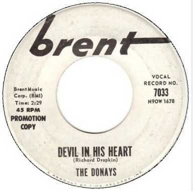 "Devil in her heart" is a song originaly recorded in Detroit by the Donays (for Correc-tone Records, and was later picked up by the New York City label Brent and was re-released in August, 1962), as "(There's A) Devil In His Heart" (on Brent 7033, with the B-side "Bad Boy"). It was written by Richard P. Drapkin, who recorded under the name Ricky Dee, and it appeared in the United Kingdom on the Oriole label. The Donays only made one record, but their lead singer, Yvonne Allen, recorded solo, and later joined The Elgins at Motown.