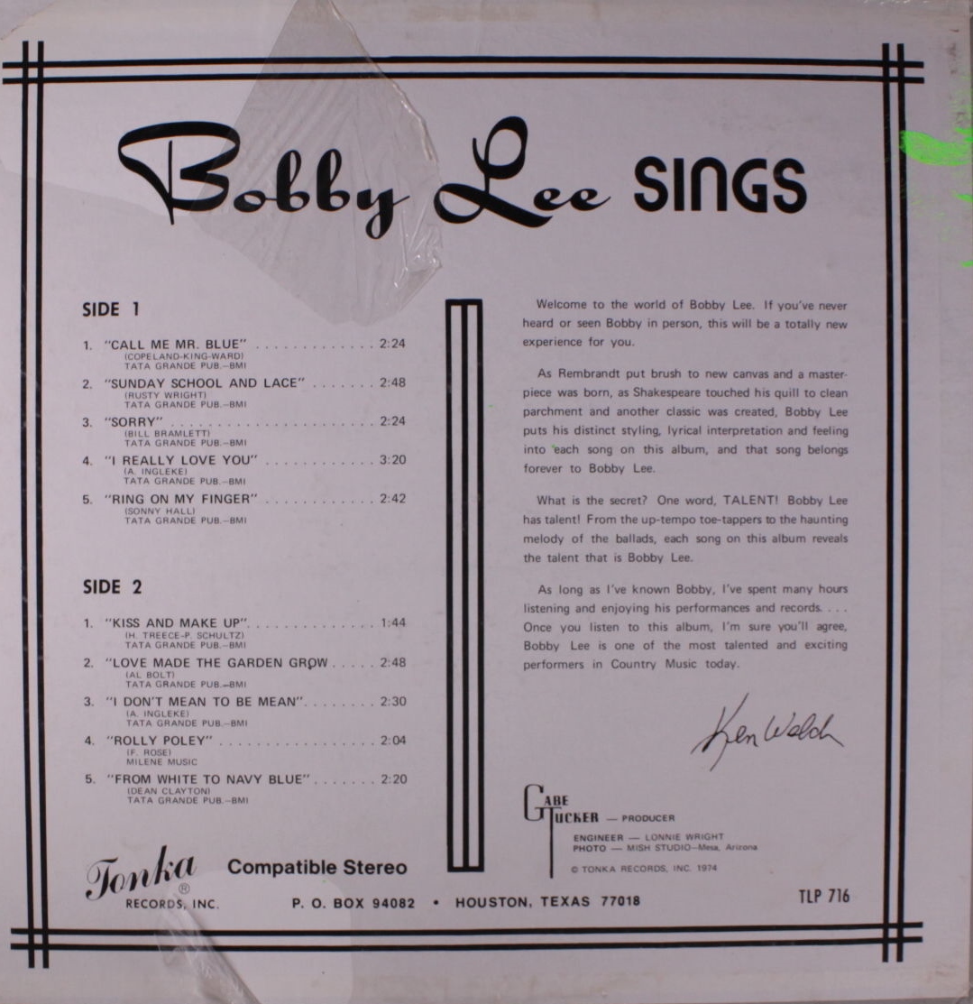 Zum Abschluß drehen wir zeitlich den Spieß um und zitieren noch einen sehr frühen Bobby Lee, einen Country-Interpreten, mit dem man, wie ich annehme, kaum eine Verbindung zu den anderen Bobby Lees herstellen kann.