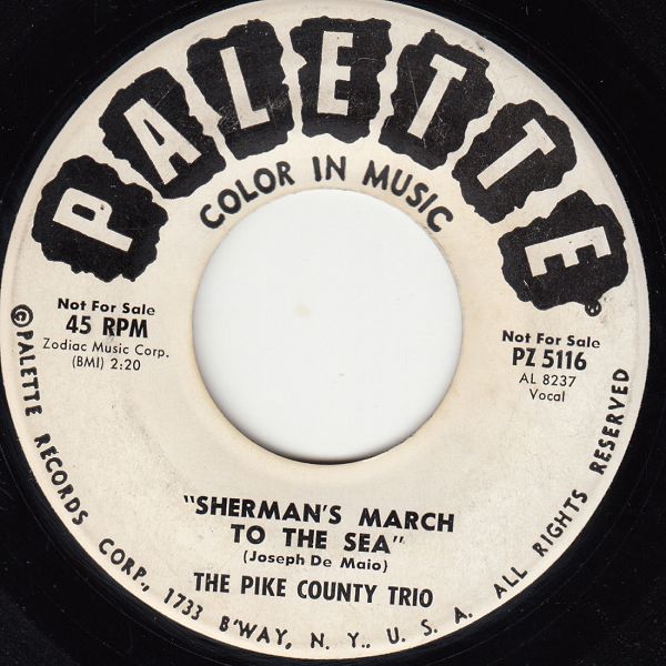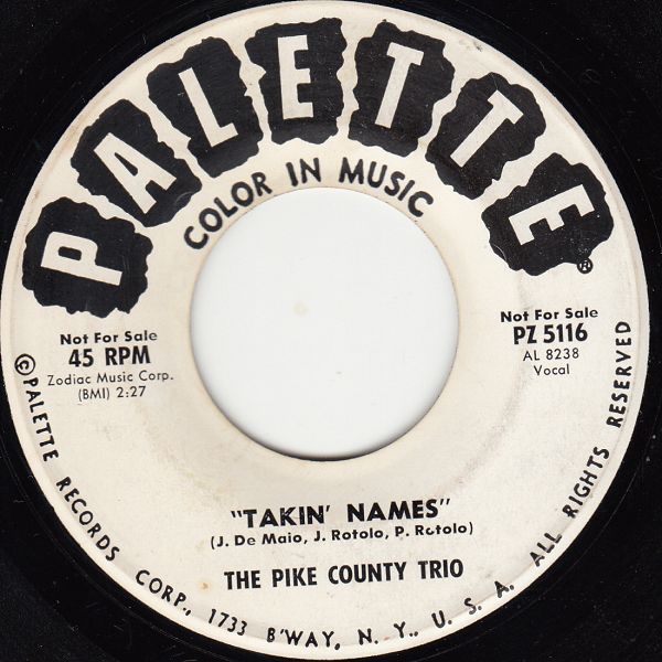 Im Dezember 1963 gab es bei PALETTE in den USA zwei Titel von einem Pike County Trio, dessen Mitglieder ich bis dato nicht eruieren konnte. Da es sich um zwei Traditionals handelt, auf die sich die Autoren Joseph De Maio, Joseph Rotolo und Paul Rotolo gestürzt haben wäre es nicht unwahrscheinlich, dass die drei „Traditional-Autoren“ auch die Mitglieder dieses Trios waren; bisher aber nur eine reine Vermutung. Wenn mich meine Ohren nicht täuschen, dürfte das Trio aus Belgien stammen, wo sich auch der Sitz des Mutter-Labels befindet. Der Gesang ist zwar in englischer Sprache, aber mit einem eropäischen Akzent behaftet, bilde ich mir jedenfalls ein. Den Titel “Takin’ Names“ gibt es übrigens im Juni 1964 auf der belgischen PALETTE von den Los Mayas in französischer Sprache als “Quand il faut s'en aller“, wo sich J. De Maio, J. Rotolo und P. Rotolo ebenfalls verewigten und für den französischen Text war Frank Gérald zuständig.