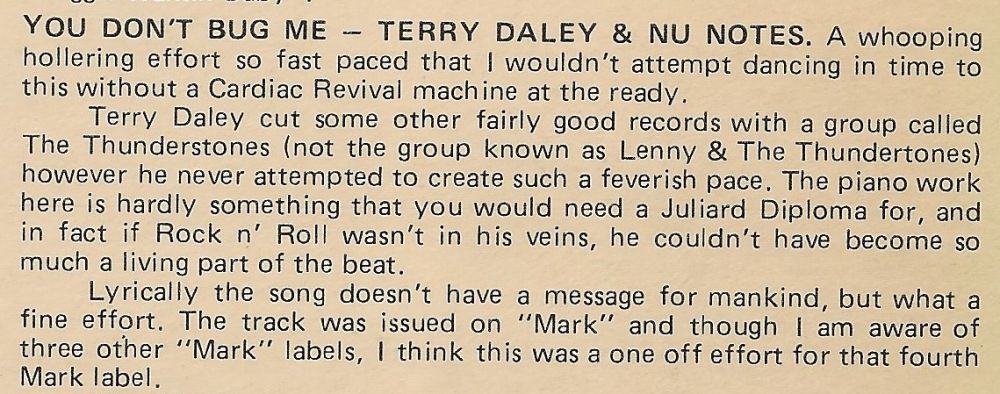 Terrance Michael Daly wurde am 20. August 1939 in Whitesboro/New York geboren. Während der Schulzeit lernte er Gitarre spielen. 1957 traf Daly den Gitarristen Joe DePalma. Die beiden beschlossen, eine Band zu gründen. Kurz darauf stiessen der Pianist Andy Cittadino (DePalma’s Cousin) und Daly’s Schulfreund Freddie Nicotera als Schlagzeuger dazu. Auch ein Bassist wurde gefunden: Roger Griffin. Die fünf Jungs übten zweimal die Woche, mit dem Ziel, eine Singleplatte aufzunehmen. Im Telefonbuch fanden sie das kleine Aufnahmestudio von Kevin Grouchy. Der hatte einen netten Song geschrieben, “Why Did This Happen“, den er als A-Seite wünschte. Dafür konnte die Band kostenlos im Studio proben. Eines Nachts entstand ganz spontan der Song “You Don’t Bug Me No More“, wobei Terry Daly den Text kreierte und sang. Grouchy schickte die beiden Aufnahmen seinem Freund Stanley Markowski von Mark Records. Der taufte die Musiker “Terry Daly & The Nu-Tones“ und veröffentlichte die Single. Bei den Radiosendern WTLB Utica und WKBW Buffalo wurde die Platte ein Top-Hit. Aber der Vertrieb von Mark Records war mangelhaft, weshalb der grosse Erfolg ausblieb. Die Band war eine Zeitlang um New York und in Kanada auf Tournee. Dann trennten sich die Nu-Tones. Einzig Andy Cittadino und Joe DePalma blieben dem Musikgeschäft treu und formierten die Gruppe “Andy & The Classics“. Terry Daly gründete eine Familie und startete ein eigenes Geschäft für Kunststoff-Verkleidungen für Gebäude. 2015 verstarb Terry Daly im Alter von 76 Jahren.