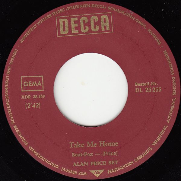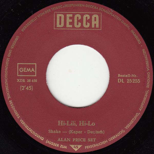 09 66....DL 25 255....ALAN PRICE SET..Hi-Lili, Hi-Lo (XDR 38 456)/Take Me Home (XDR 38 457) (GB: 12442)