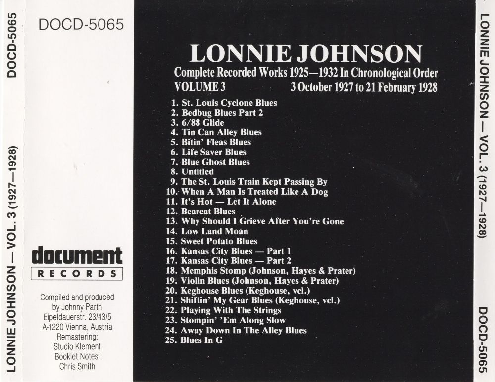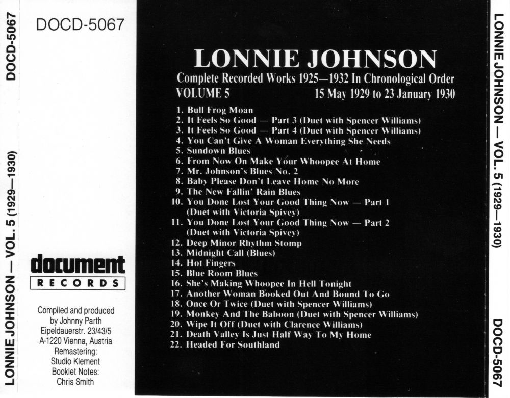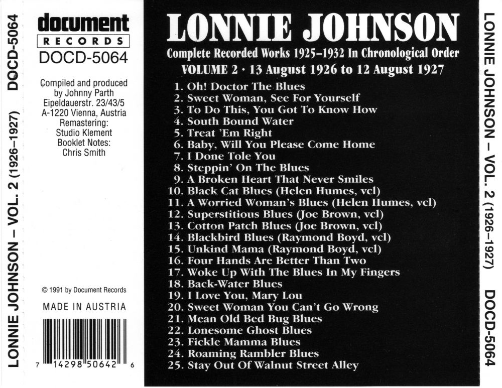 commenced to recording at an astonishing pace -- between 1925 and 1932, he cut an estimated 130 waxings. The red-hot duets he recorded with white jazz guitarist Eddie Lang (masquerading as Blind Willie Dunn) in 1928-1929 were utterly groundbreaking in their ceaseless invention. Johnson also recorded pioneering jazz efforts in 1927 with no less than Louis Armstrong's Hot Five and Duke Ellington's orchestra.