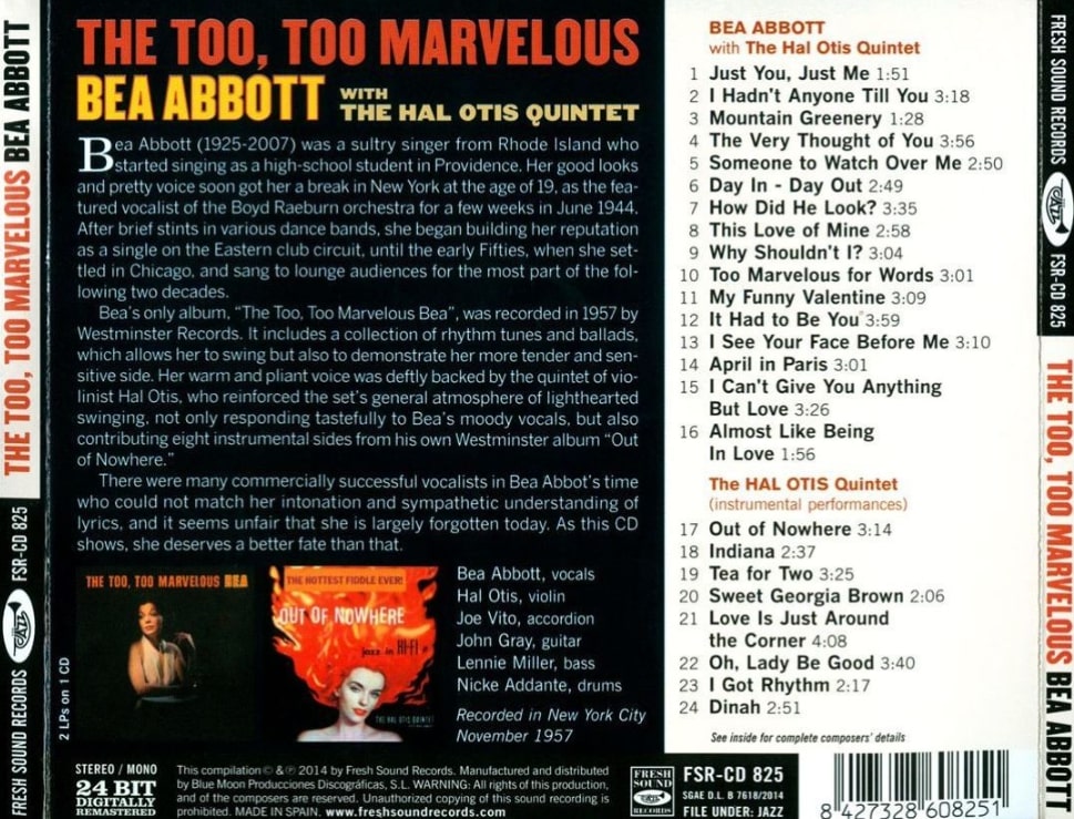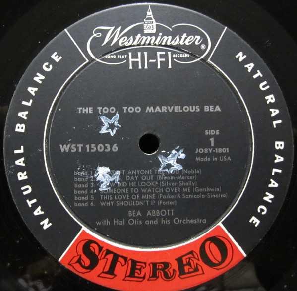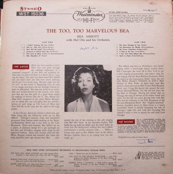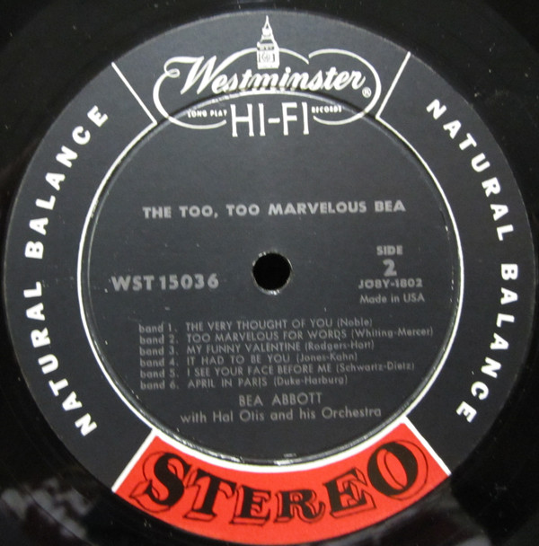 Beas einziges Album, The Too, Too Marvelous Bea, wurde 1957 von Westminster Records aufgenommen. Es enthält eine Sammlung von Rhythmusmelodien und Balladen, die ihr den Swing, aber auch ihre zartere und sensiblere Seite ermöglichen. Ihre warme und geschmeidige Stimme wurde geschickt vom Quintett des Violinisten Hal Otis unterstützt, der die allgemeine Atmosphäre des unbeschwerten Swings des Sets verstärkte und nicht nur geschmackvoll auf Beas launischen Gesang reagierte, sondern auch acht Instrumentalstücke aus seinem eigenen Westminster-Album Out of Nowhere beisteuerte.