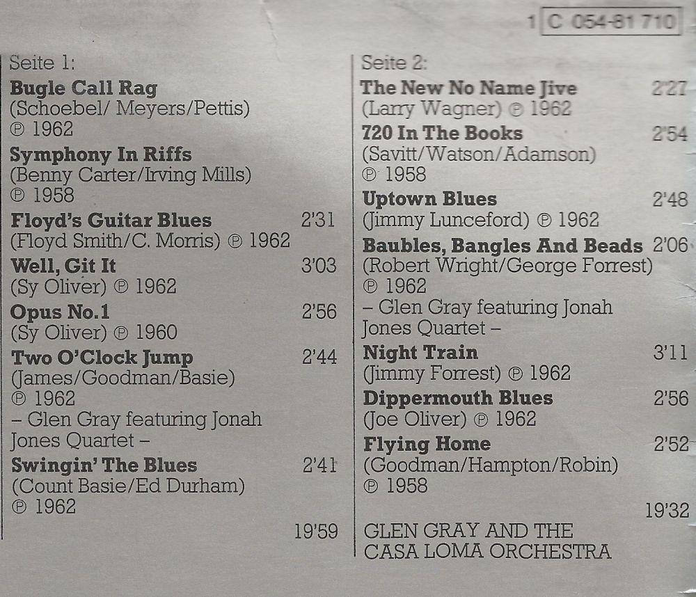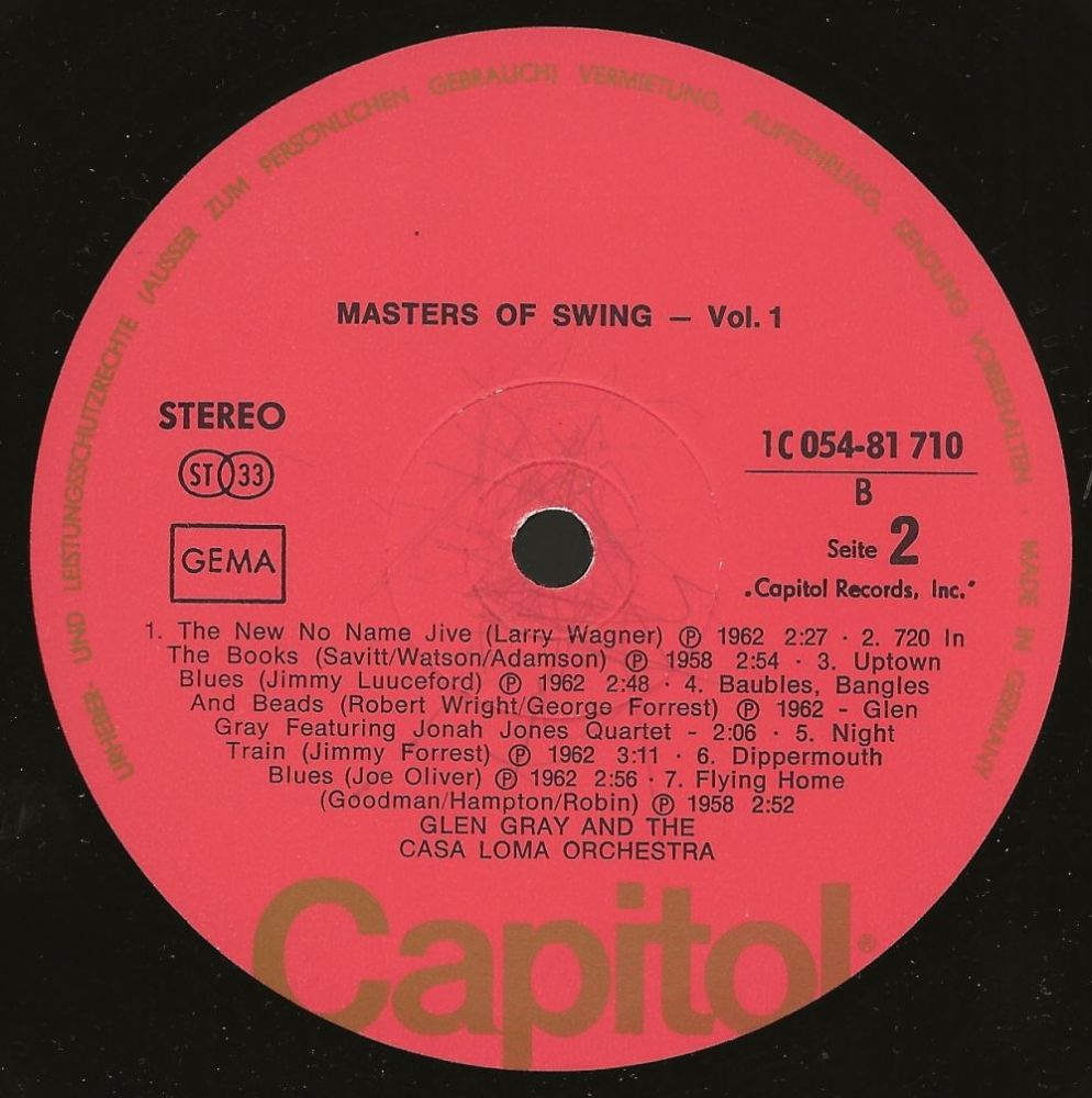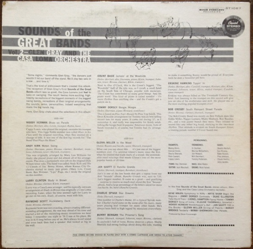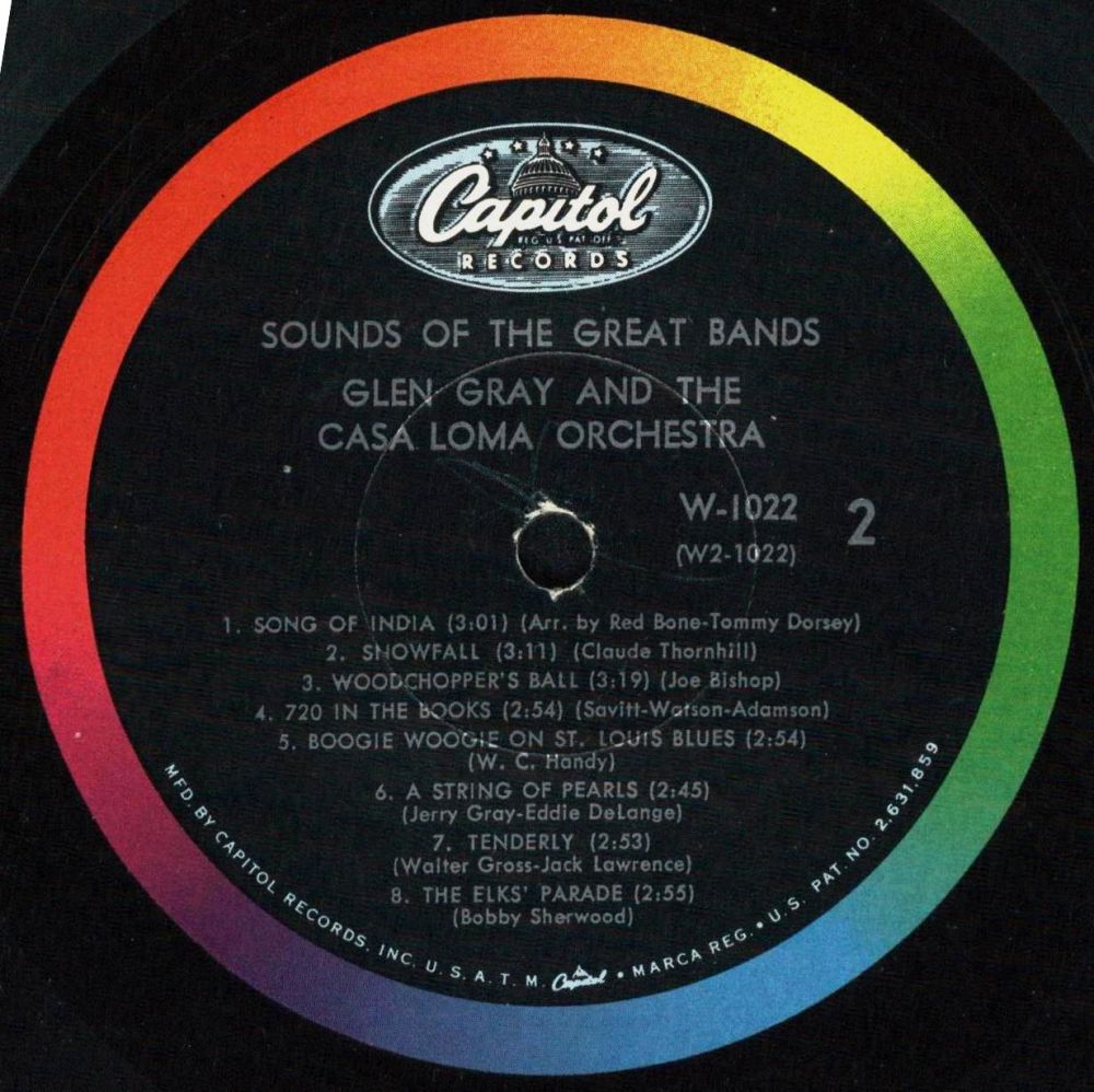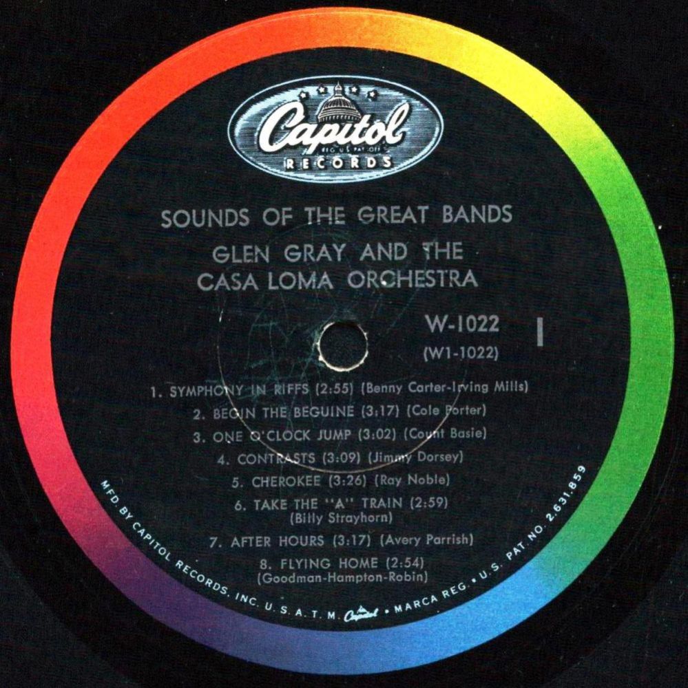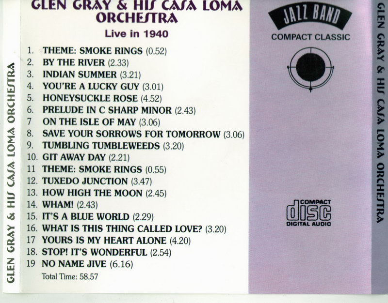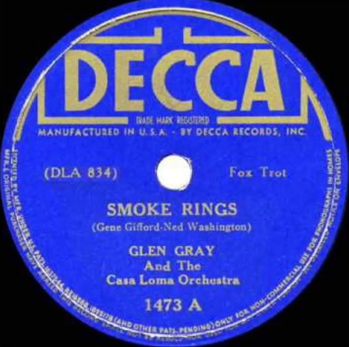 While the early swing of Glen Gray’s Casa Lomans’ may sound outdated today, the band’s late 1930s and early 1940s recordings like Stompin’ Around, Come And Get It, Malady In F, Zig Zag, Swingtonic, and No Name Jive are still great listens today. Two of the bands biggest records were ballads; For You as sung by Kenny Sargent and the group's theme Smoke Rings.