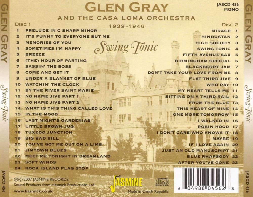 In 1933 and 1934 the group was featured on the Camel Caravan radio program, becoming the first swing band to appear on a commercial radio series. They played both summers at the Glen Island Casino, where frequent radio broadcasts helped boost their popularity across the country. The Casa Loma Orchestra began to be billed under leader Glen Gray’s name in 1935, recording for Decca until 1942, and later for Mercury until 1946.