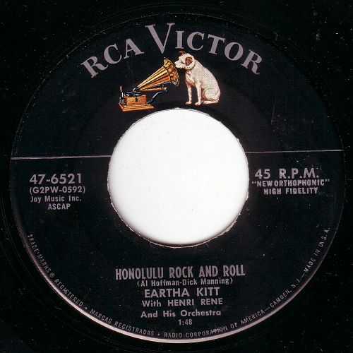Die am 17.1.1927 in North, South Carolina, als Eartha Mae Keith geborene Eartha Kitt ist gestern im 81 Lebensjahr an einem Krebsleiden verstorben. "Die Königin der Nachtclubs" wie man die Sängerin und Schauspielerin auch nannte prägte ihre Zeit musikalisch sehr stark. Wer kennt nicht "Santa Baby", "C'est si bon" oder "Jonny" und vieles mehr. Aber mit dem kurze Ausflug ins Rock 'n' Roll-Genre mit der Moon Mullican-Nummer "Honolulu Rock And Roll" paßt sie nicht nur zeitmäßig sondern auch musikalisch 100%ig ins Forum. Bye Bye And See You Later Eartha