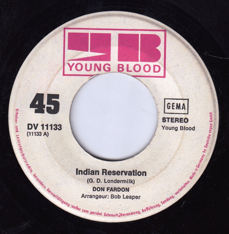 je nach Geschmack favorisieren Beat-Fans Indian Reservation in der Version von Don Fardon (1968) oder von Paul Revere & The Raiders (1971). Auch eine deutsche Coverversion von Marco Polo (1970) ist um Umlauf. Geschrieben hat den Song John D. Loudermilk. Die Originalversion stammt vom Country- und Rock-A-Billy Sänger Marvin Rainwater. Das ist erst auf den zweiten Blick zu erkennen, denn auf der Platte steht nichts von Indian Reservation. Die Erstpressung erschien bereits am 25. Januar 1960 (!) auf MGM:
