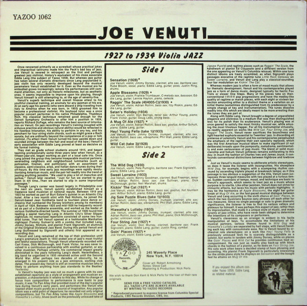 Er trat 1923 sein erstes Engagement gemeinsam mit dem Gitarristen Eddie Lang (1940.3) an. Mit der für die damalige Instrumentierung sehr ungewöhnlichen Besetzung im Duo mit Gitarre war Venuti sehr erfolgreich; 1926 nahmen Lang und er im Duett zentrale Dokumente des frühen Jazz auf (spätere LP “Stringing The Blues“). Es ist als sein Verdienst zu sehen, dass sich die Geige als Jazzinstrument im Chicago Jazz etabliert hat. Nach ersten Engagements bei Red Nicholds (1940.1) und Jean Goldkette (1940.1) spielte er ab 1927 bei Paul Whiteman (1940.1). In Folge arbeitete er mit den meisten wichtigen weißen Jazz-Musikern der späten 1920 ern und frühen 1930 ern. Mit seinen Blue Four und Harold Arlen als Sänger hatte er mit dem für Columbia eingespielten Song “Little Girl“ mit # 4 seinen ersten Hiterfolg in den Billboard Top 10.