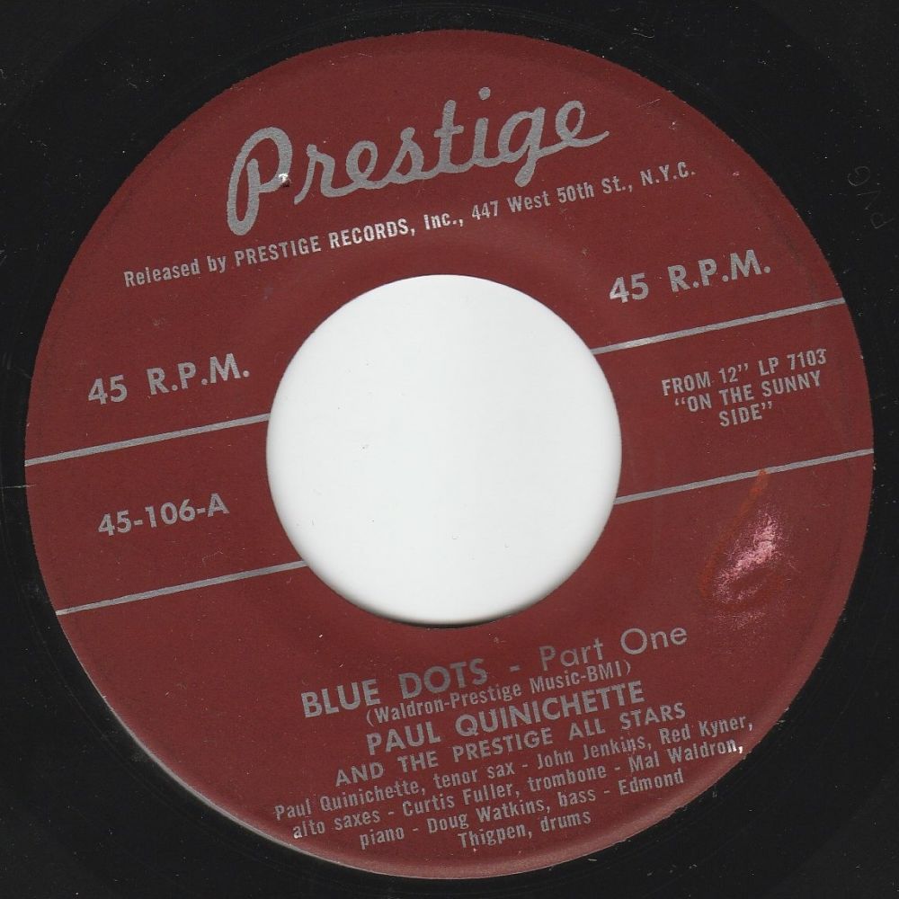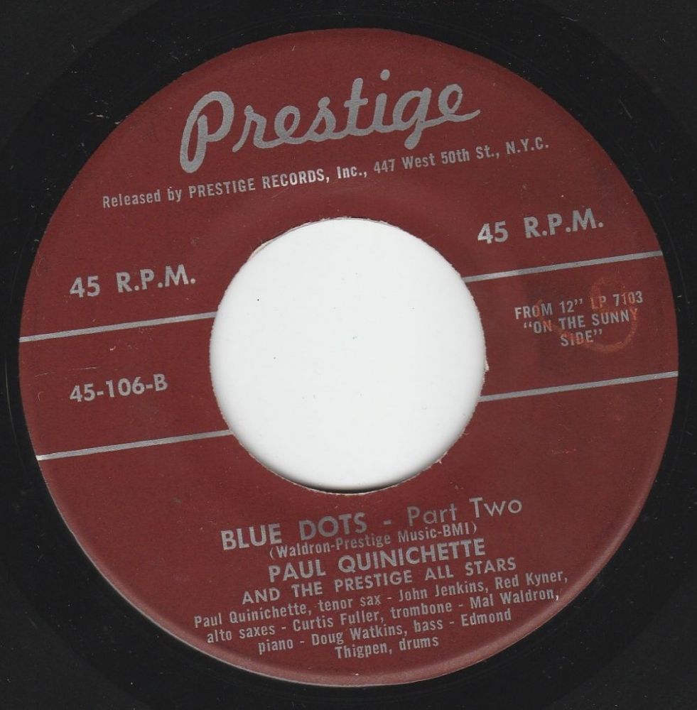 ?? 57....45-106-A....PAUL QUINICHETTE AND THE PRESTIGE ALL STARS Paul Quinichette, tenor sax - John Jenkins, Red Kyner, alt saxes - Curtis Fuller, trombone - Mal Waldron, piano - Doug Watkins, bass - Edmond Thigpen, drums..Blue Dots - Part One/-B....Blue Dots - Part Two
