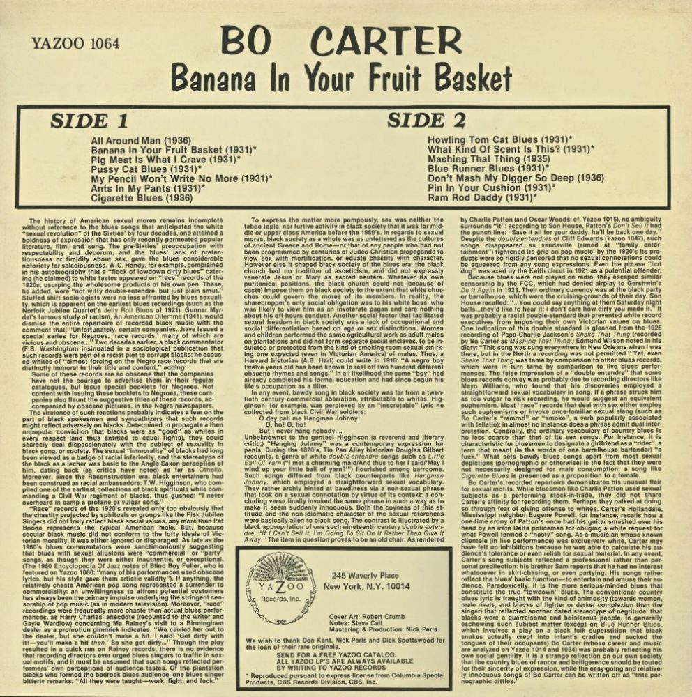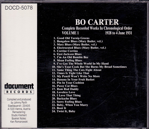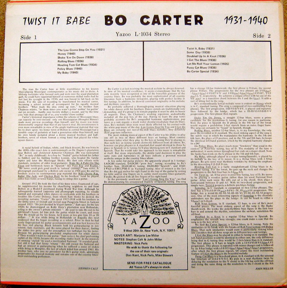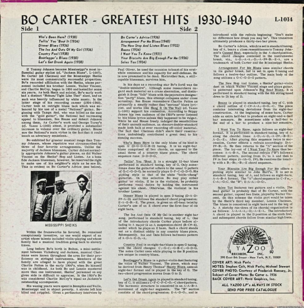 Es genügt zu sagen, dass es einige Zeit gedauert hat, bis sich Bo Carters rechtmäßiger Platz in der Bluesgeschichte etabliert hat. Wenn nur wenige von uns Carter ohne die Pionierleistungen von Samuel Charters überhaupt kennen würden, so ist es umso wahrer, dass eine umfassende Wertschätzung von Carter ohne die drei neu aufgelegten LPs von Nick Penis und ihre Liner Notes von Steve Calt, Mike Stewart, John Miller und Perls selbst (Yazoo L-1014, L-1034 und L-1064) unmöglich wäre. In diesen Alben wurde das Beste aus Bo Carters Werk für eine neue Generation von Zuhörern zusammengestellt, und die Liner Notes, obwohl oft zu detailliert in ihren musikalischen Analysen für den Gelegenheitsleser, machten sicherlich deutlich, dass Bos Musik kompliziert und facettenreich war. Daraus können wir also schließen, die gelegentliche Kurzsichtigkeit von Charters war ein notwendiges Übel, das Penis‘ abenteuerlichen Kreuzzug im Namen von Carter provozierte. Das Ergebnis war, dass wir alle von der Neuverpackung einiger guter Musik profitierten.